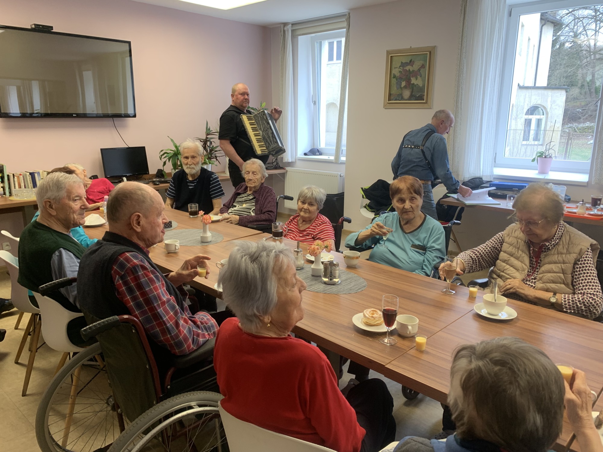 Narozeniny paní Novákové jsme všichni oslavili s plnou parádou. Občerstvení bylo výborné a nechyběli ani naši páni harmonikáři. Bylo veselo. Oslavenkyni jsme popřáli vše nejlepší k narozeninám a poděkovali za pozvání.