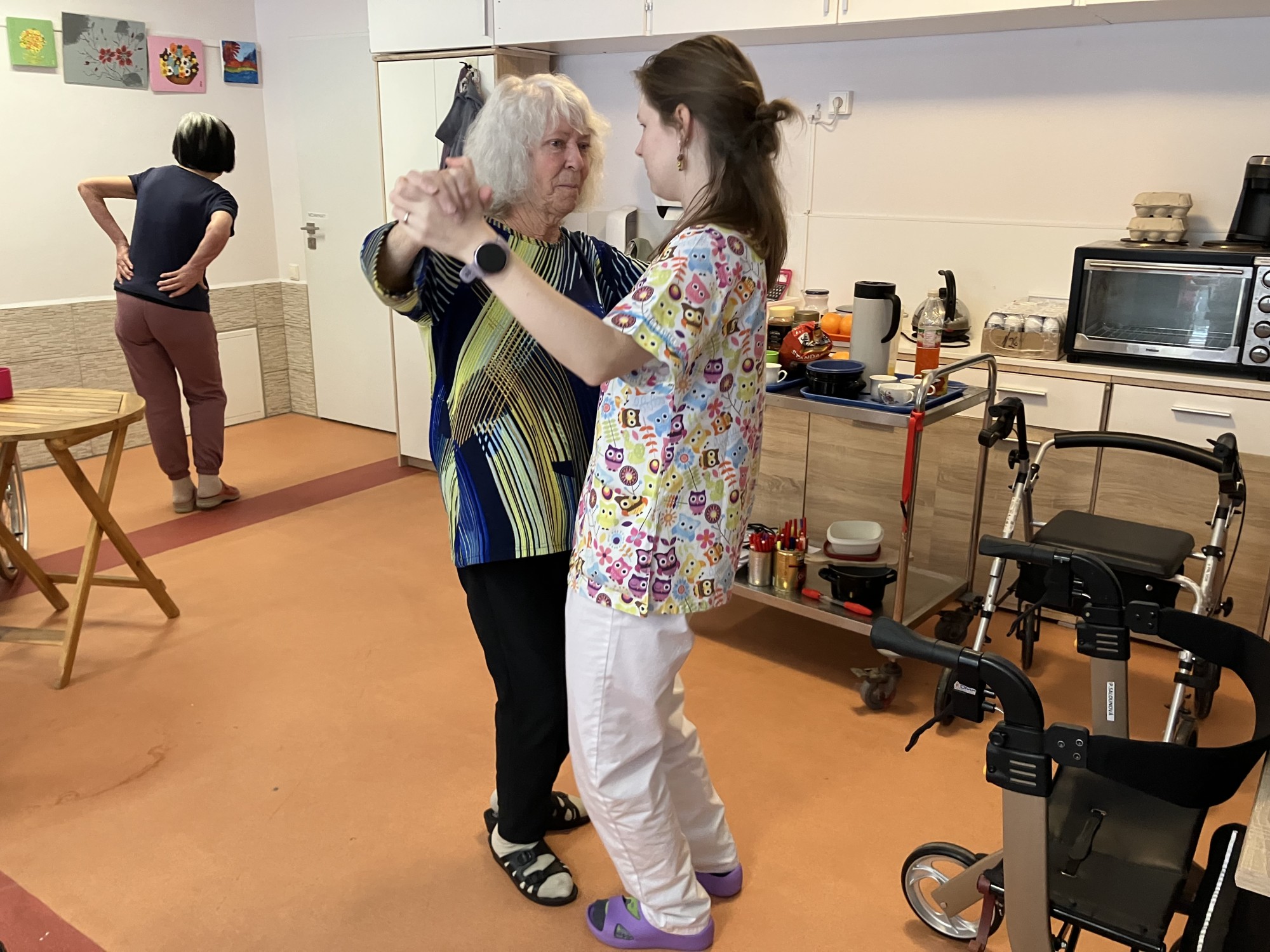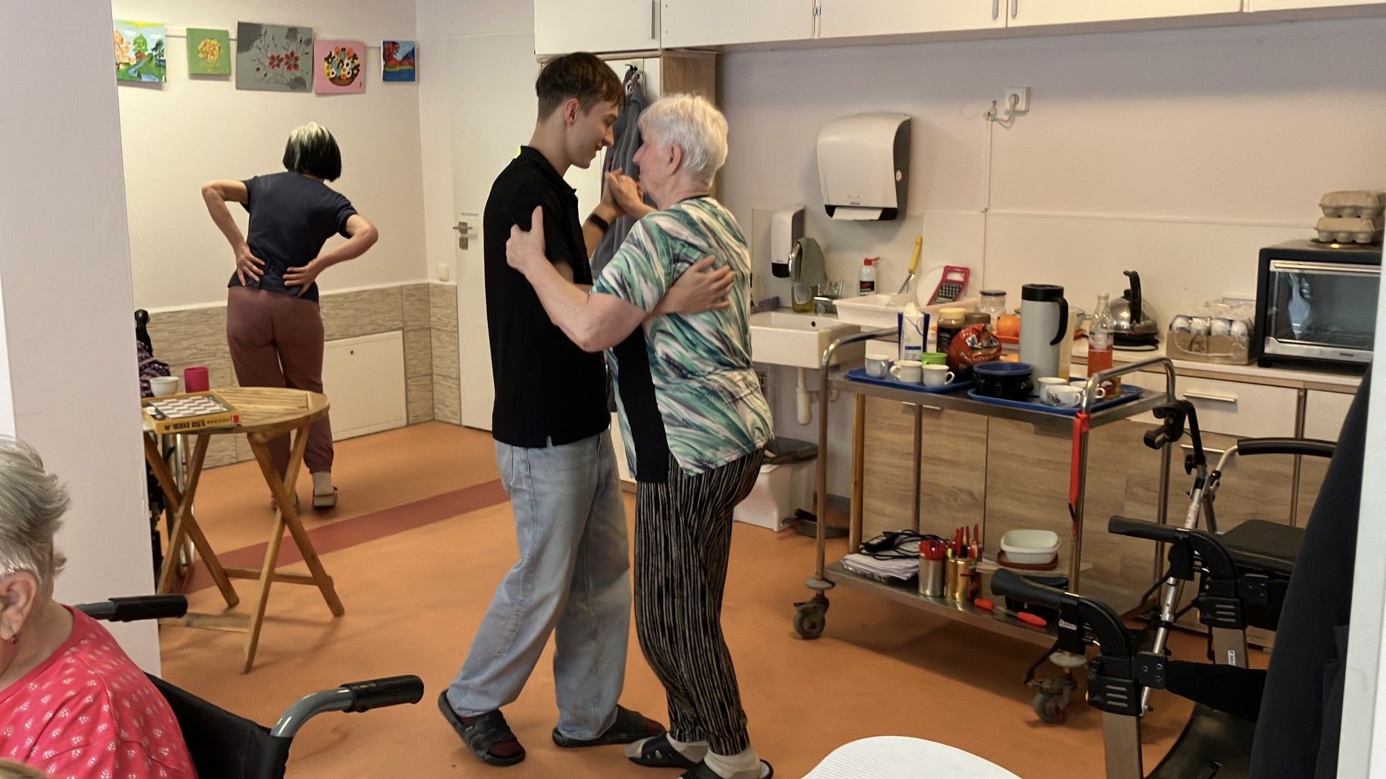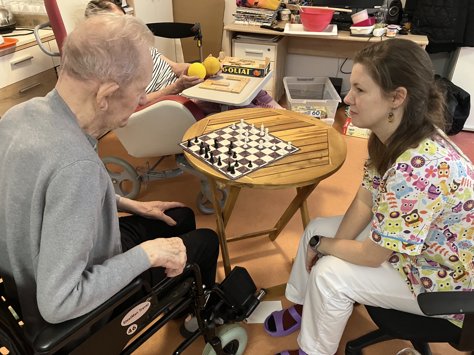 Studenti na odborné praxi se s velkým nasazením věnovali našim klientům v rámci aktivizačních činností. Společně si užili pohyb při tanci i klidnější chvíle u šachových partií. Setkání přinesla radost, přirozený kontakt a příjemně strávený čas pro obě strany.