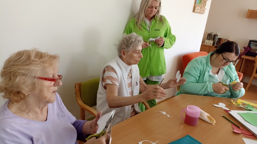 Protože rádi zkrášlujeme naši kulturní místnost, rozhodli jsme se vyrobit orchidej z papíru. Při tom jsme si obkreslováním, stříháním, skládáním a lepením procvičili jemnou motoriku. Také jsme vybarvovali a skládali obrázky. Po práci bylo třeba uvolnit horní končetiny, hlavu i záda, a tak nechyběla společná rozcvička v sedě.
