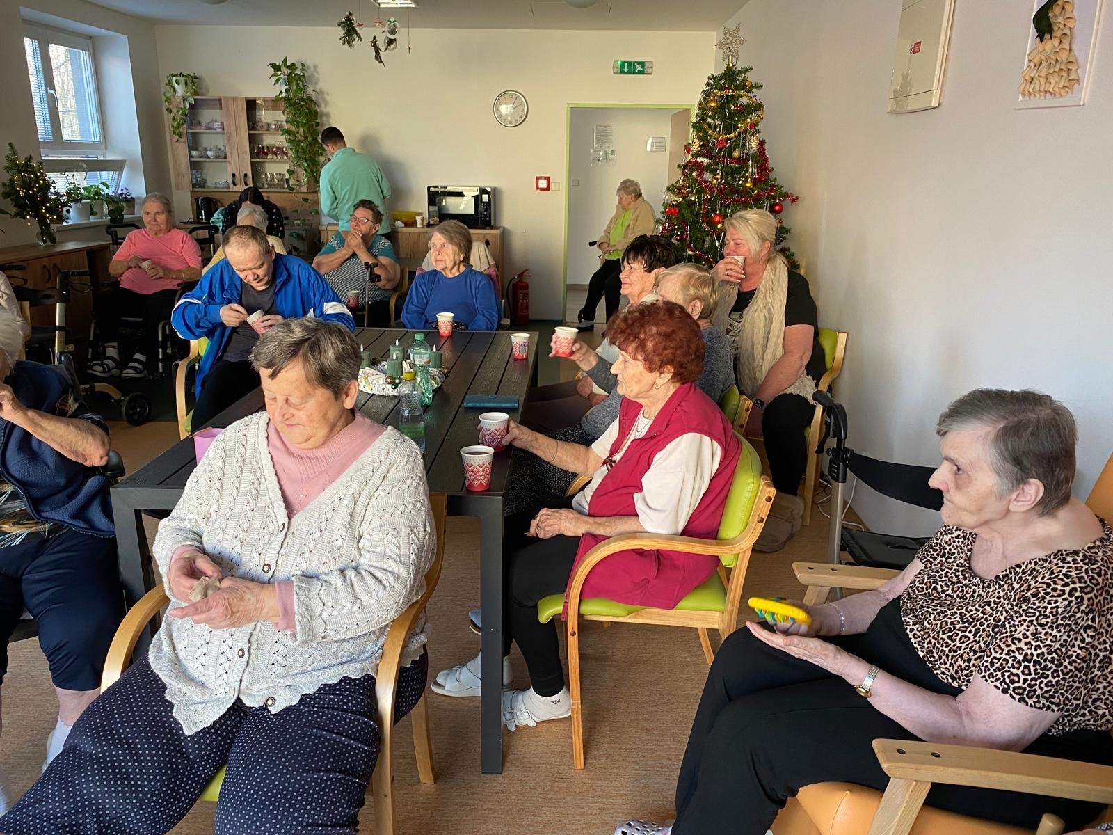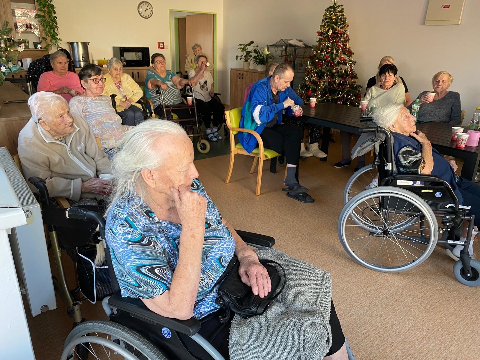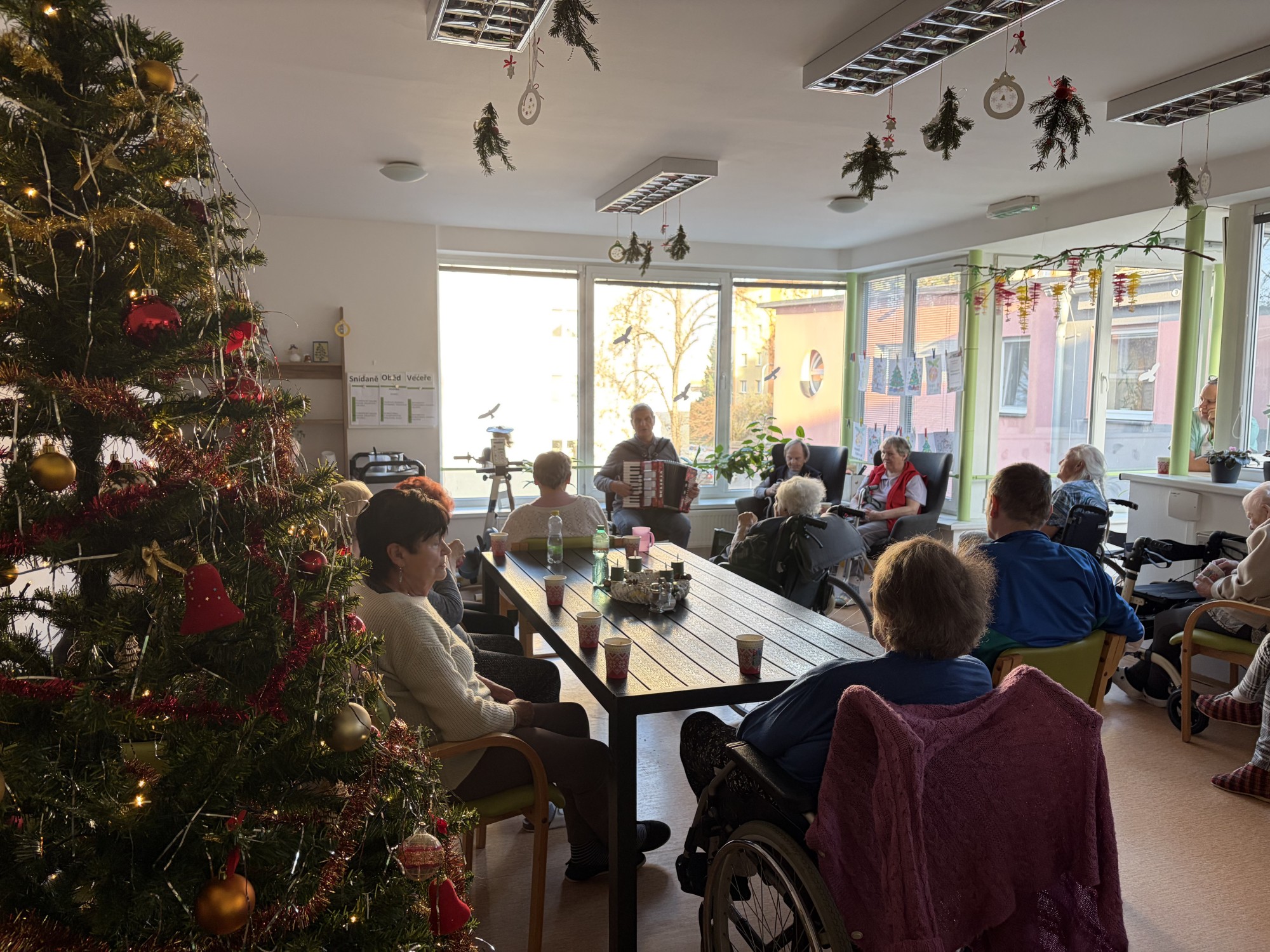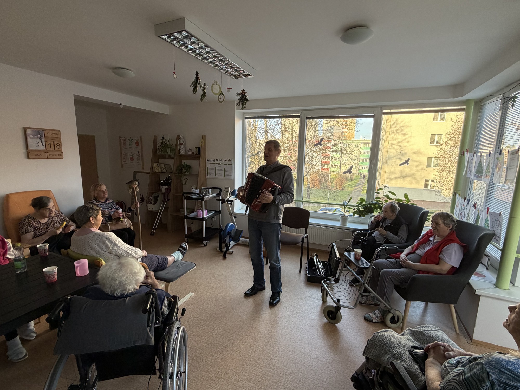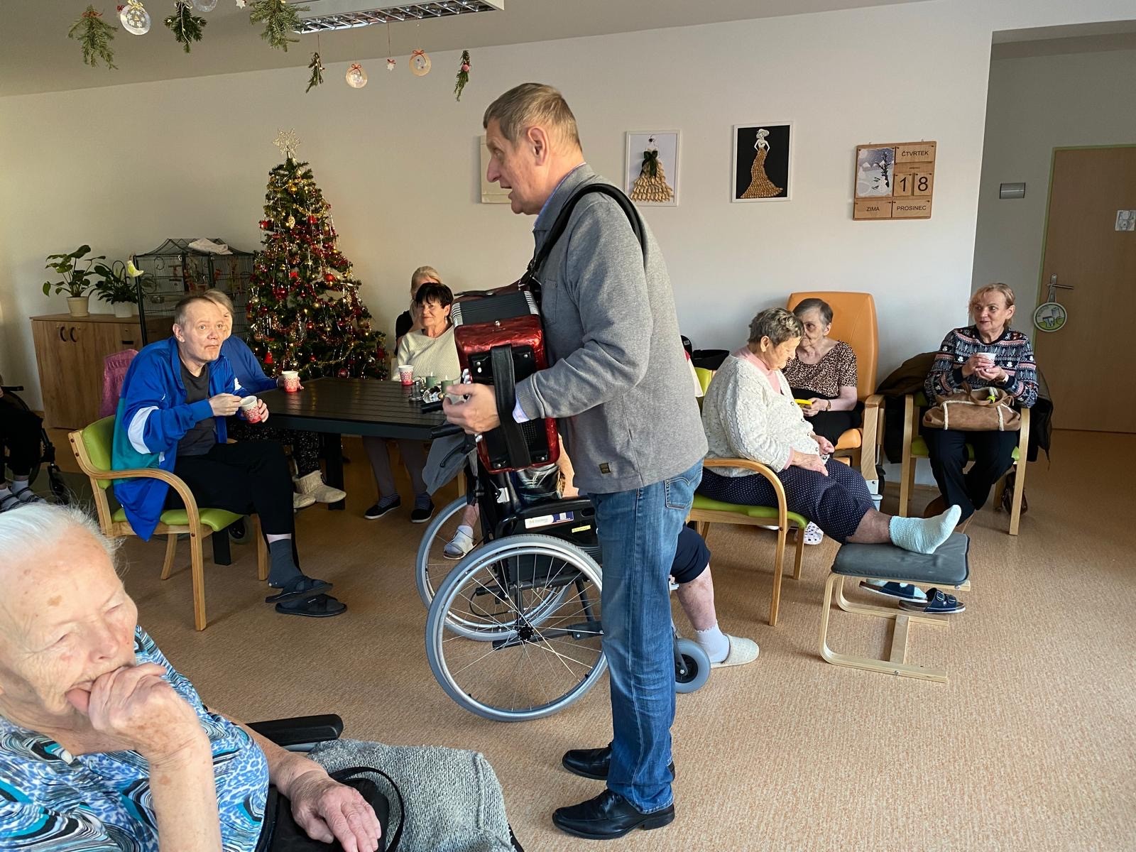 Předvánoční čtvrtek jsme si společně užili v příjemné atmosféře, kterou provázela hudba, vůně punče a dobrá nálada. Do našeho domova přijel pan Václav, aby nám zahrál na harmoniku a zpříjemnil tak adventní odpoledne. Známé písničky, melodie harmoniky a společný zpěv vytvořily krásnou sváteční náladu. Klienti si chvíle s hudbou velmi užívali, někteří si s chutí zazpívali a jiní si alespoň pobrukovali do rytmu. Děkujeme panu Václavovi za milou návštěvu a za to, že nám pomohl prožít vánoční čas o něco radostněji a srdečněji.