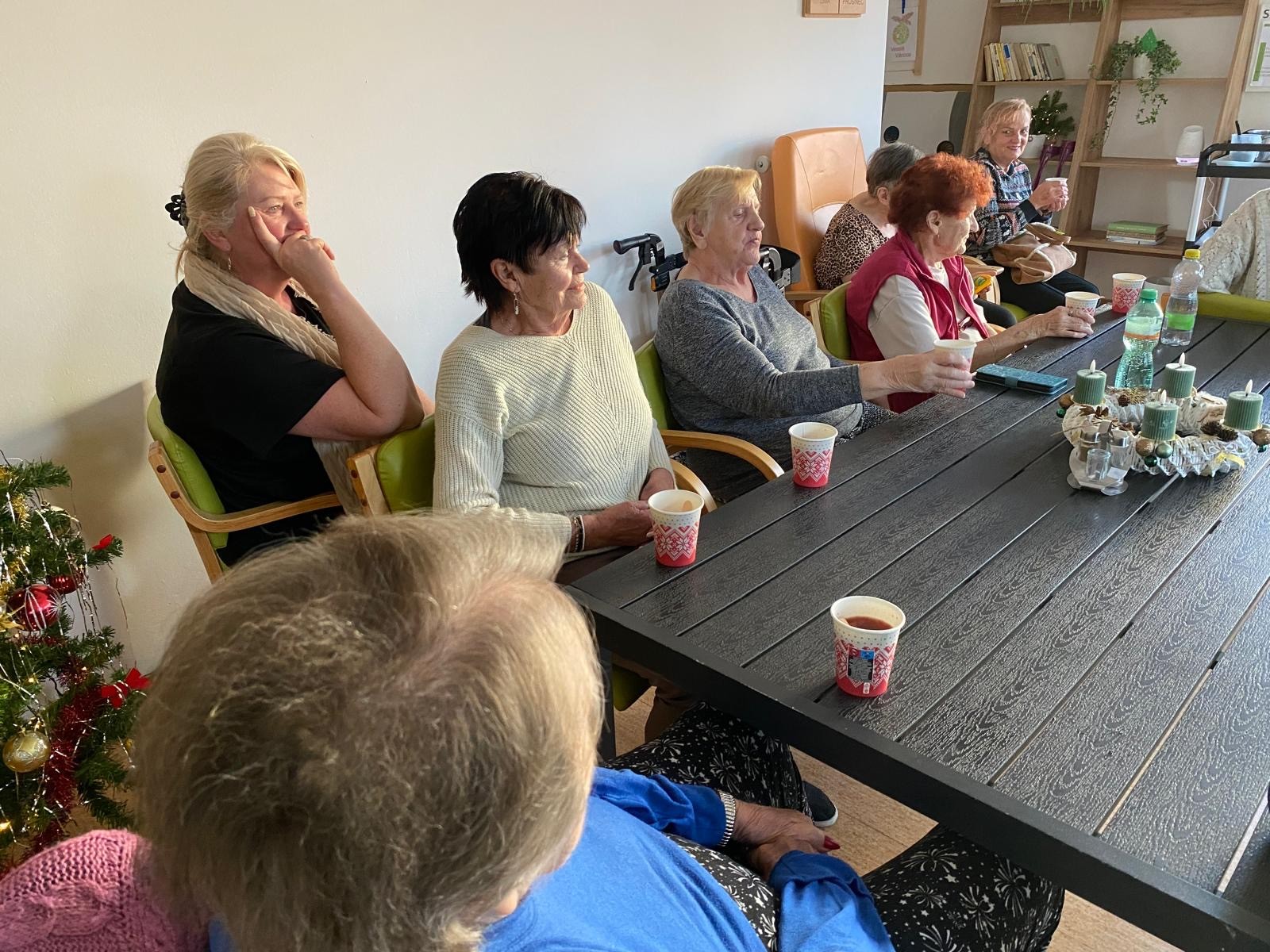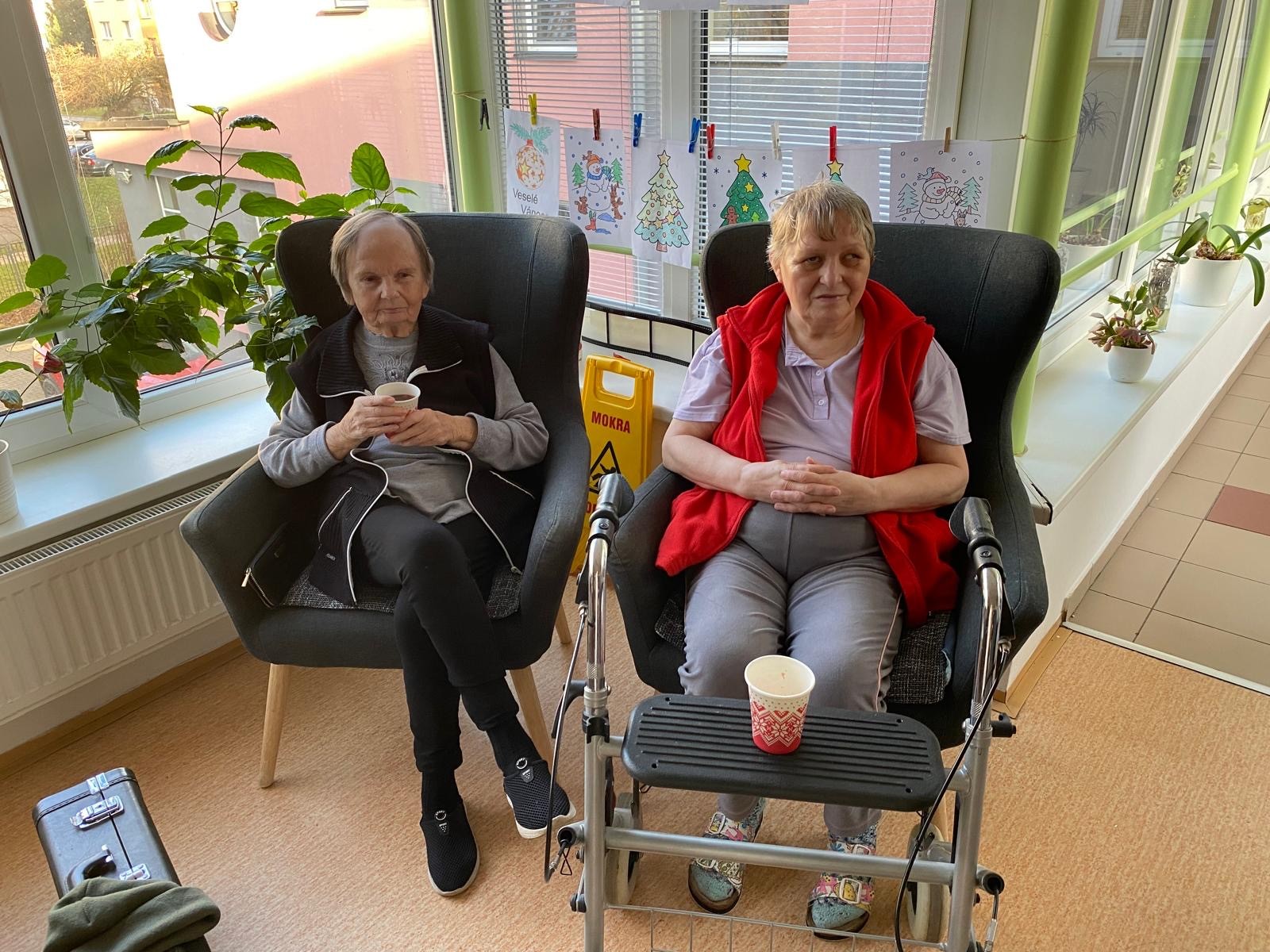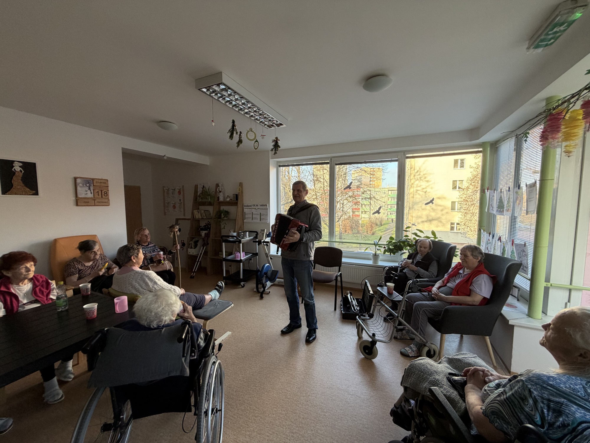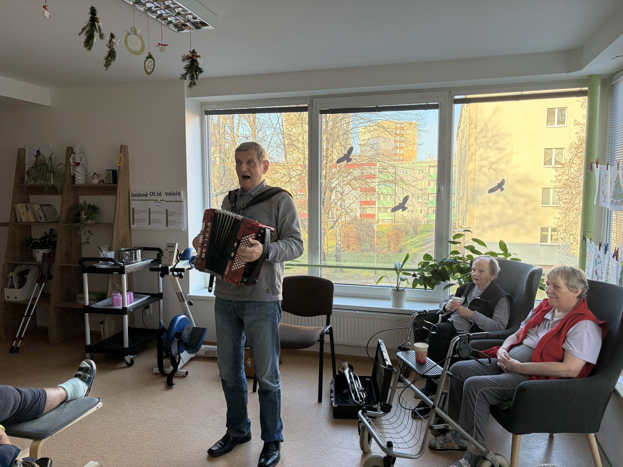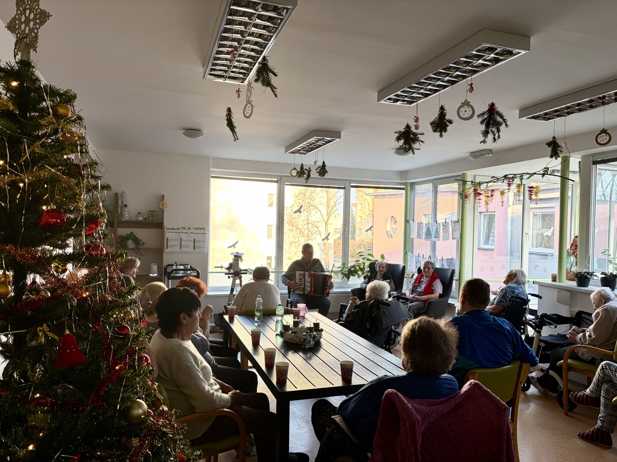 Předvánoční čtvrtek jsme si společně užili v příjemné atmosféře, kterou provázela hudba, vůně punče a dobrá nálada. Do našeho domova přijel pan Václav, aby nám zahrál na harmoniku a zpříjemnil tak adventní odpoledne. Známé písničky, melodie harmoniky a společný zpěv vytvořily krásnou sváteční náladu. Klienti si chvíle s hudbou velmi užívali, někteří si s chutí zazpívali a jiní si alespoň pobrukovali do rytmu. Děkujeme panu Václavovi za milou návštěvu a za to, že nám pomohl prožít vánoční čas o něco radostněji a srdečněji.