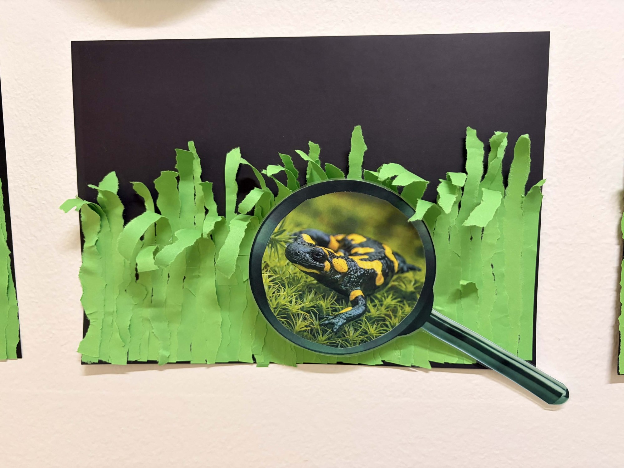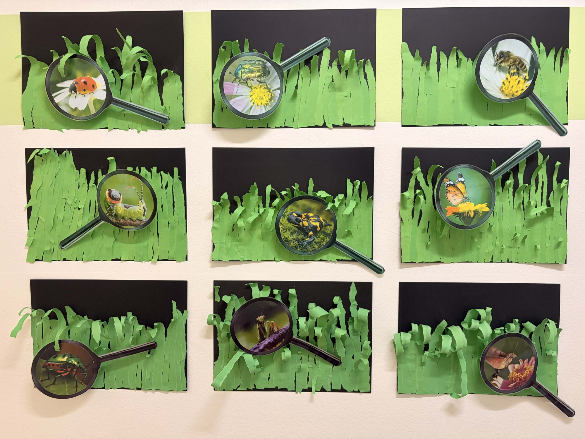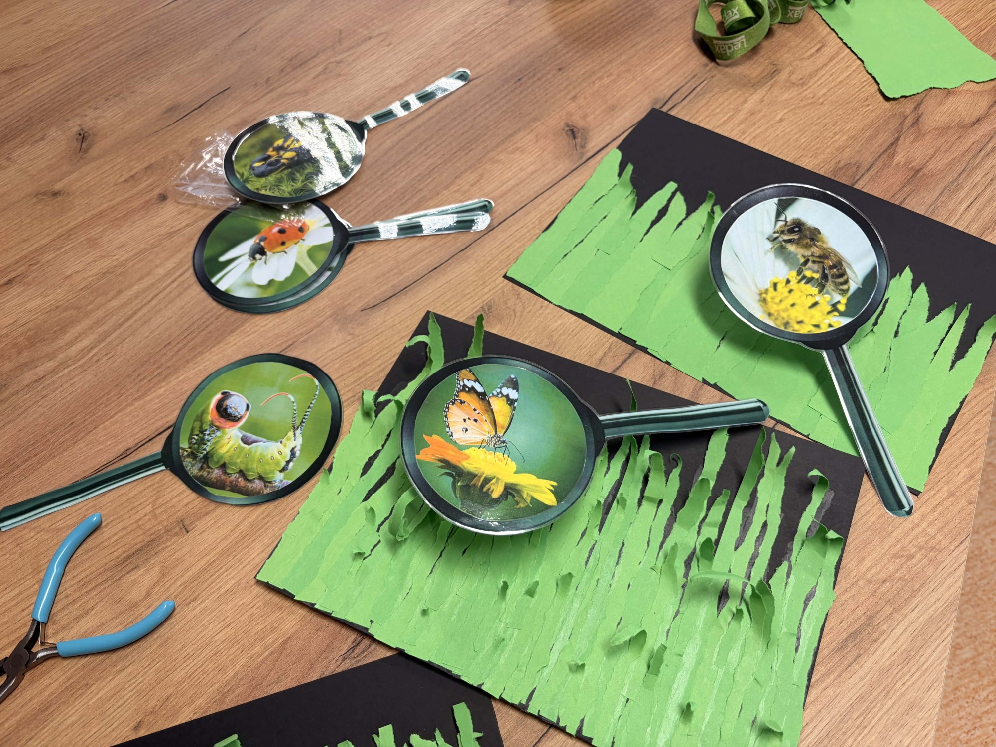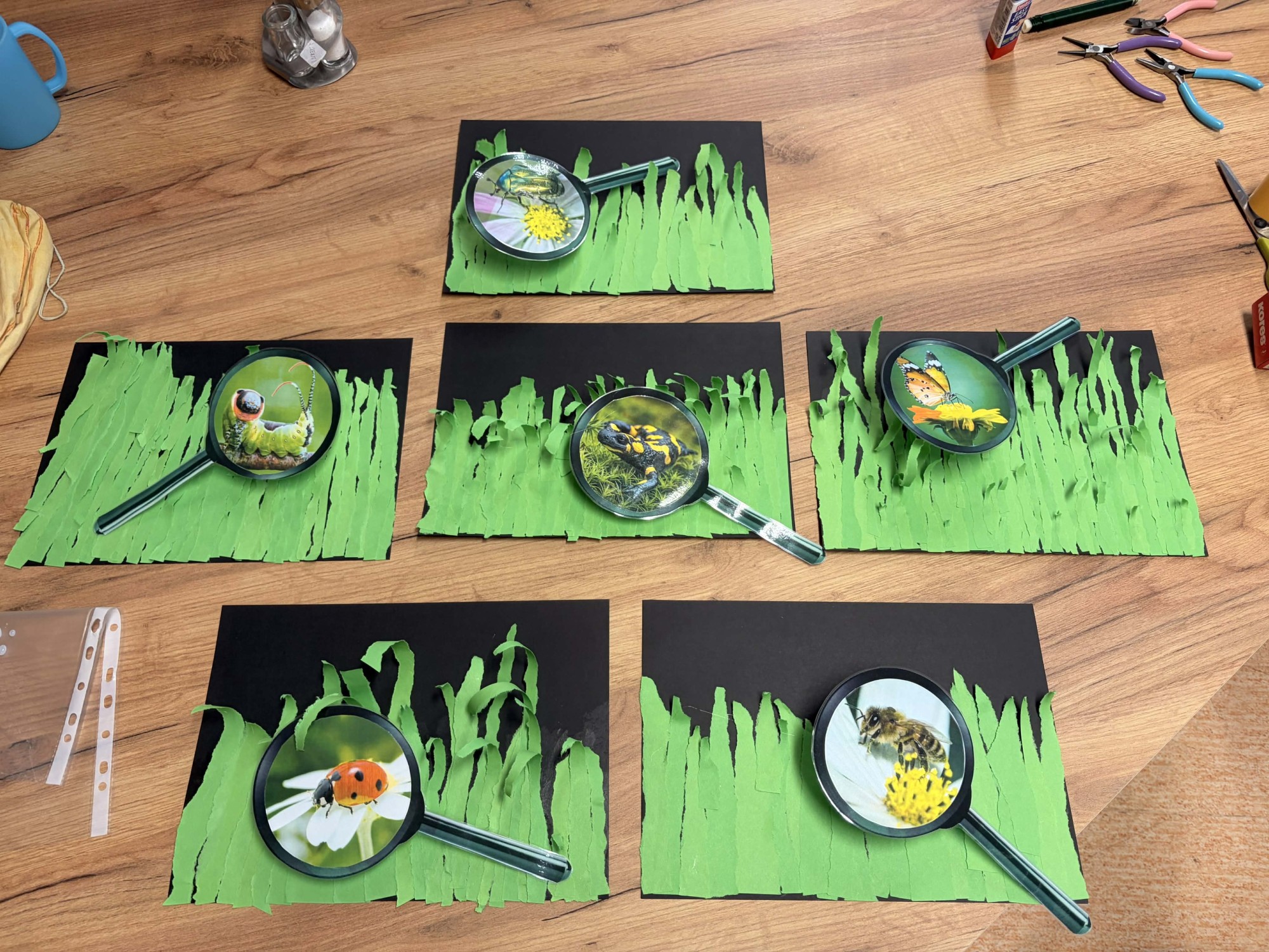 Tentokrát jsme se společně vydali na malé přírodovědné dobrodružství. Ze zeleného papíru jsme natrhali proužky a proměnili je v hustou trávu. Pak přišlo na řadu vystřižení lupy. Pod ní se začal objevovat celý drobný svět. Motýli, broučci i další malí živočichové, které jsme do trávy schovali, jako by najednou ožívali.