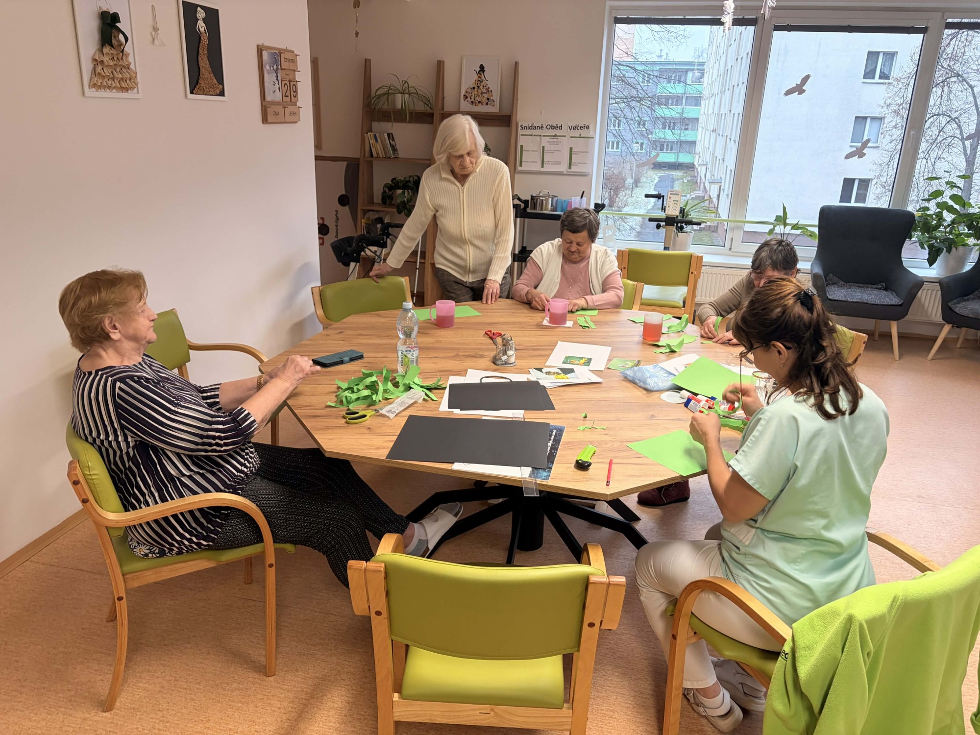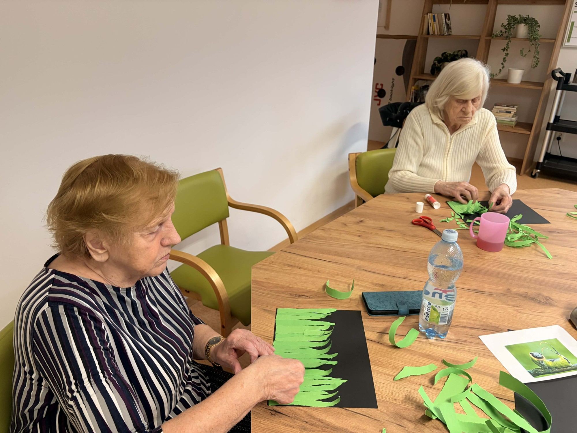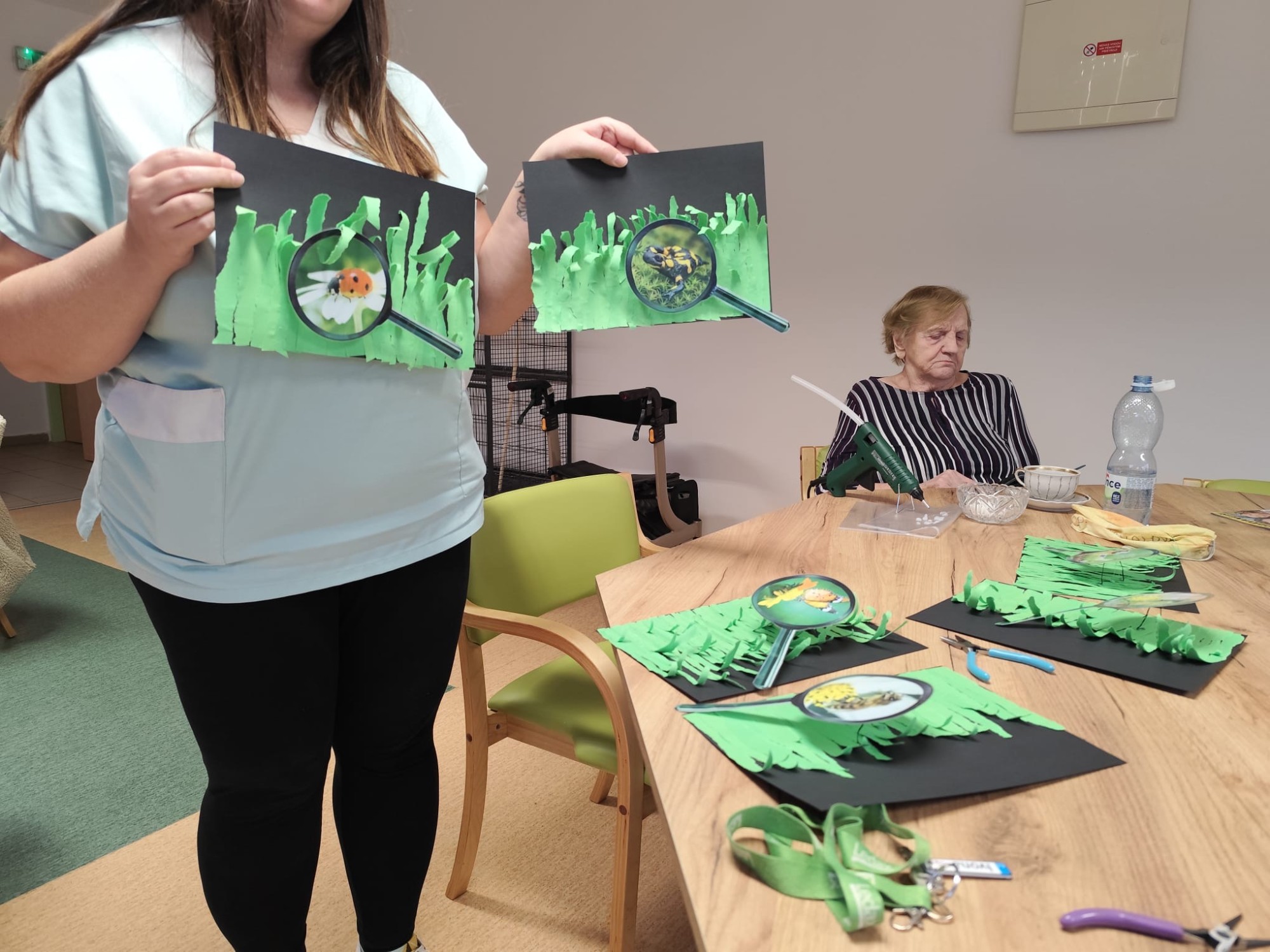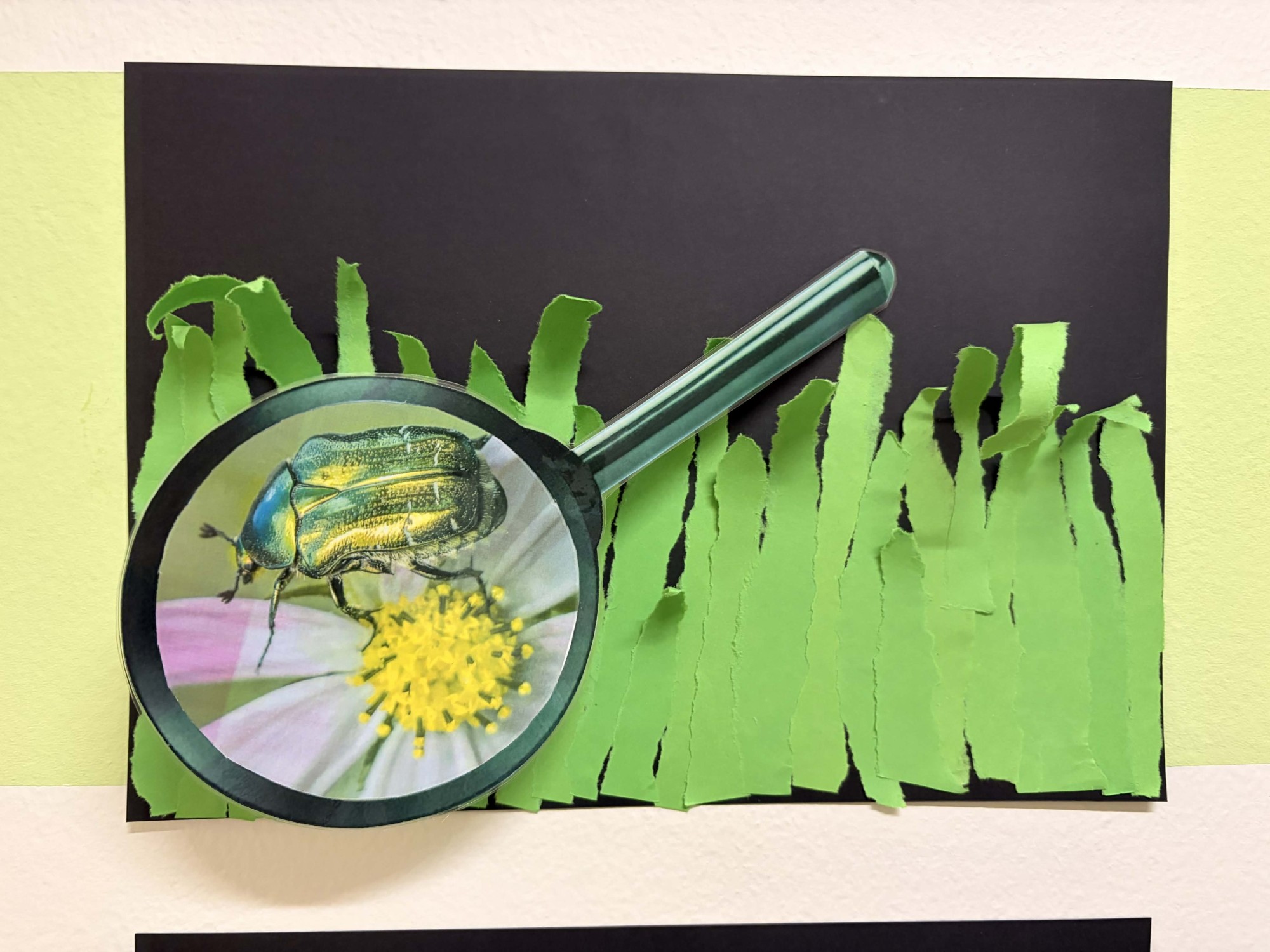Tentokrát jsme se společně vydali na malé přírodovědné dobrodružství. Ze zeleného papíru jsme natrhali proužky a proměnili je v hustou trávu. Pak přišlo na řadu vystřižení lupy. Pod ní se začal objevovat celý drobný svět. Motýli, broučci i další malí živočichové, které jsme do trávy schovali, jako by najednou ožívali.