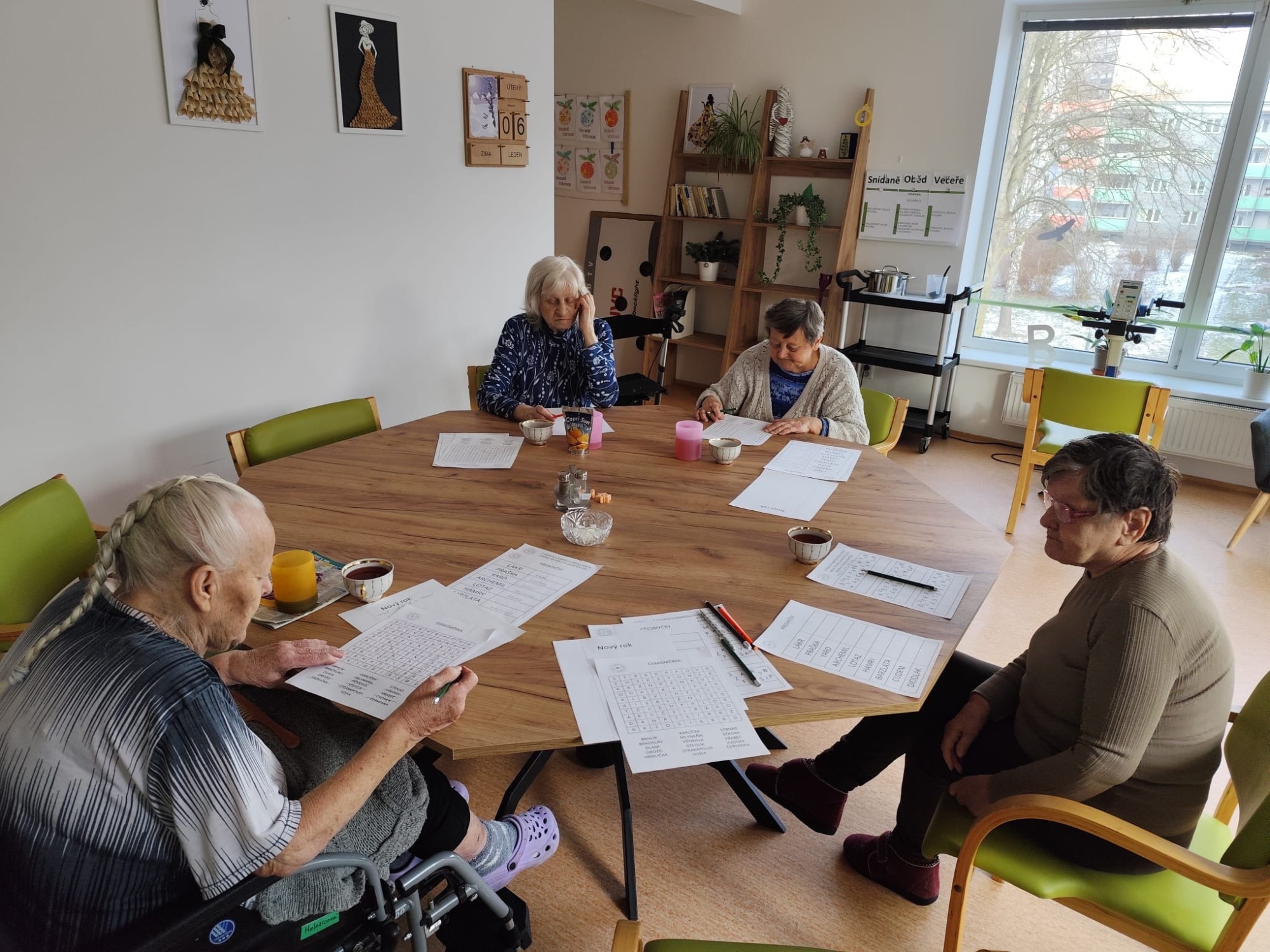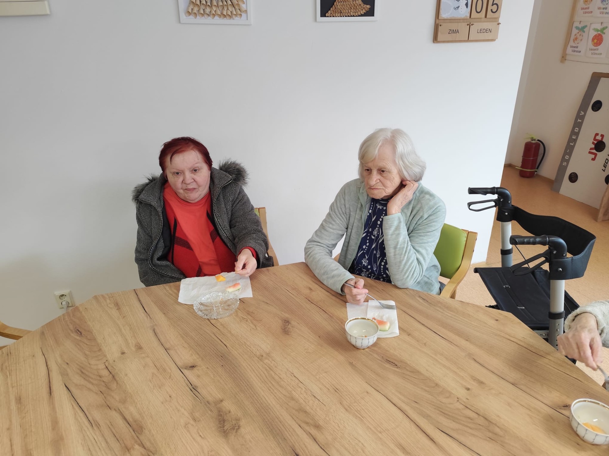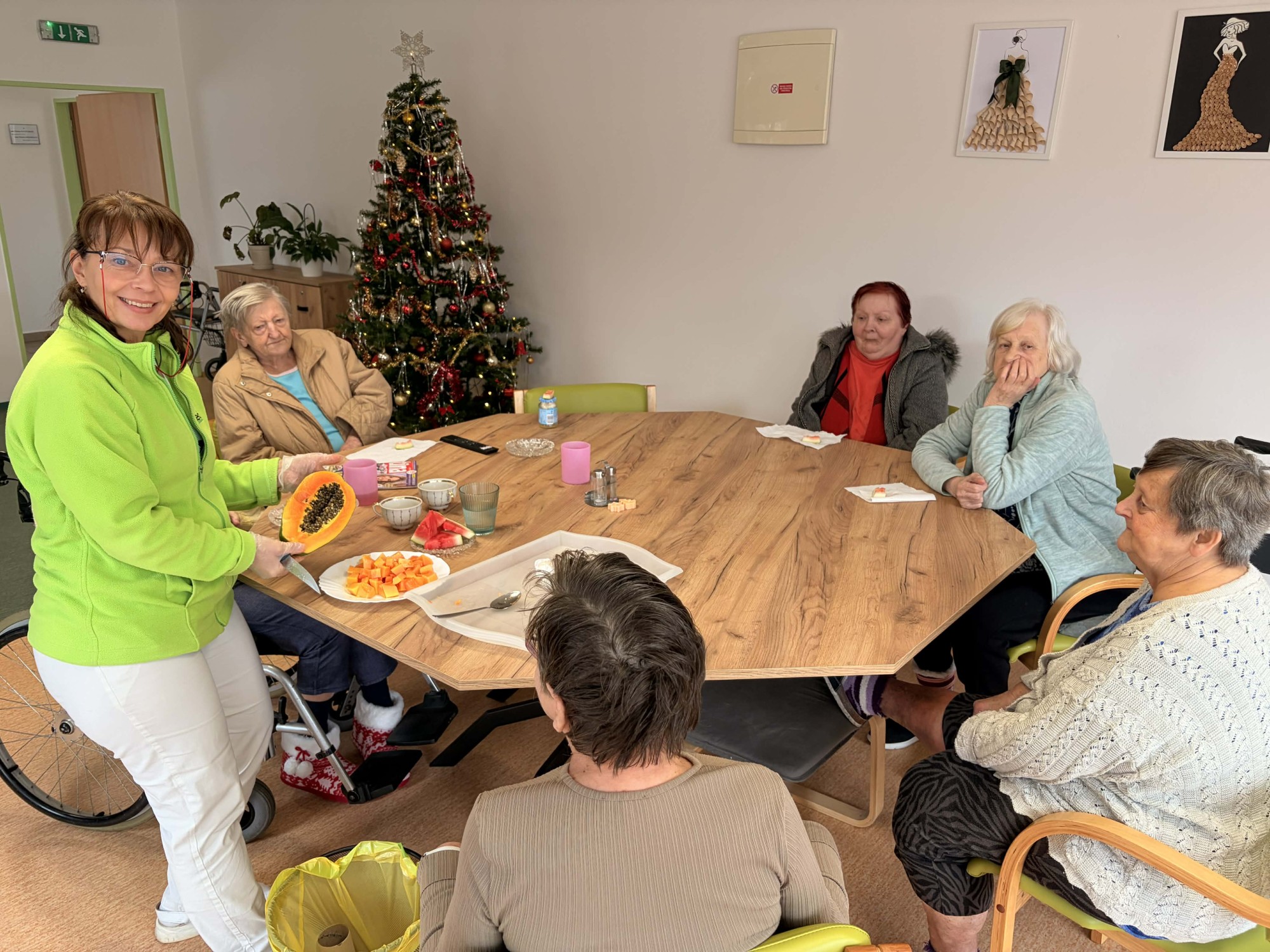 Na začátku ledna jsme se opět společně setkali v kulturní místnosti a užili si příjemné dopoledne plné pohody. Začali jsme jednoduchou rozcvičkou u stolu. Trochu jsme protáhli ruce, ramena i záda, aby se tělo hezky rozhýbalo a každý se cítil dobře. Pak přišlo na řadu povídání. Vzpomínali jsme na vánoční svátky, sdíleli si zážitky, tradice i to, jaké dárky kdo dostal nebo komu udělal radost. Nezapomněli jsme ani na trénink paměti. Procvičili jsme si kognitivní funkce zábavnou formou, každý podle svých možností. A jako sladká tečka na závěr? Pochutnali jsme si na vodním melounu a papáji, které nám připomněly trochu léta i uprostřed zimy.
