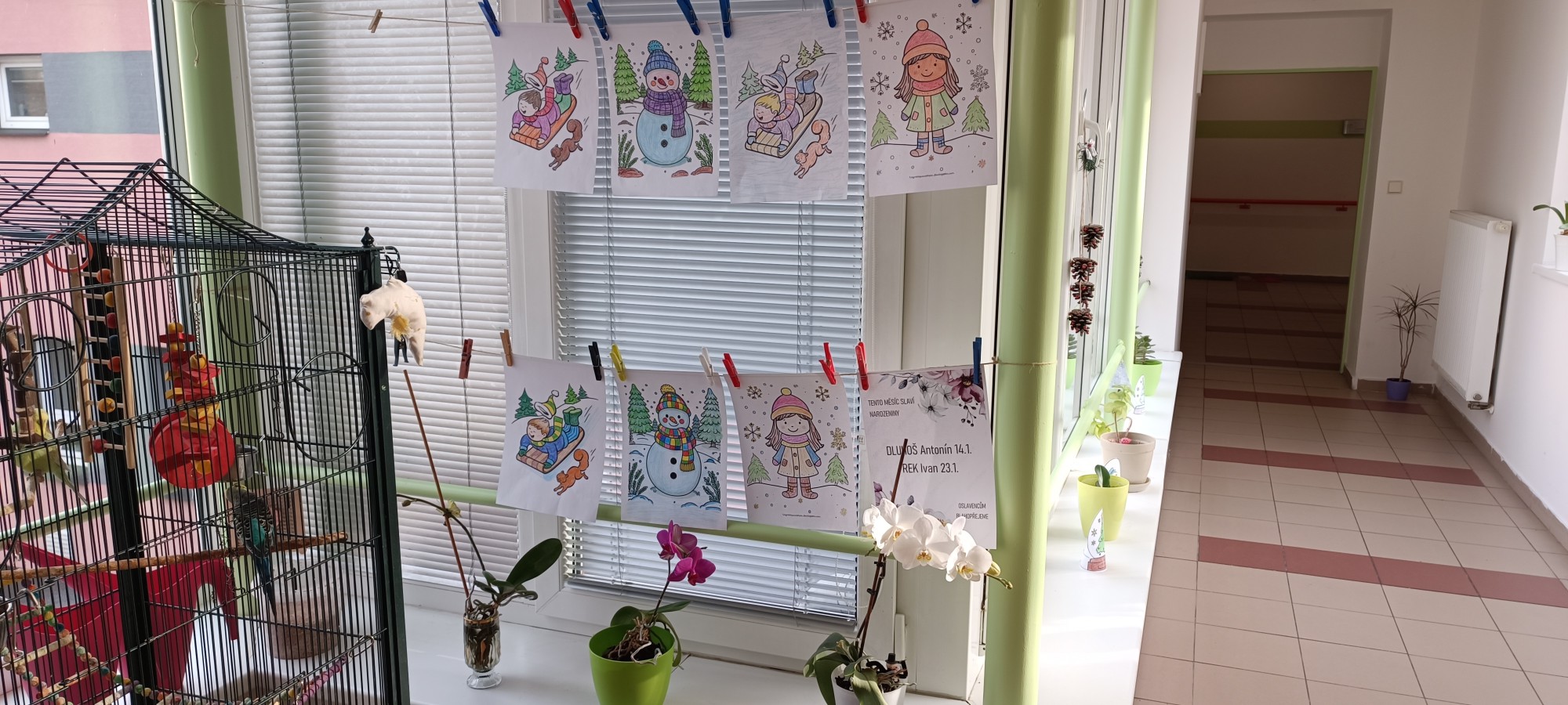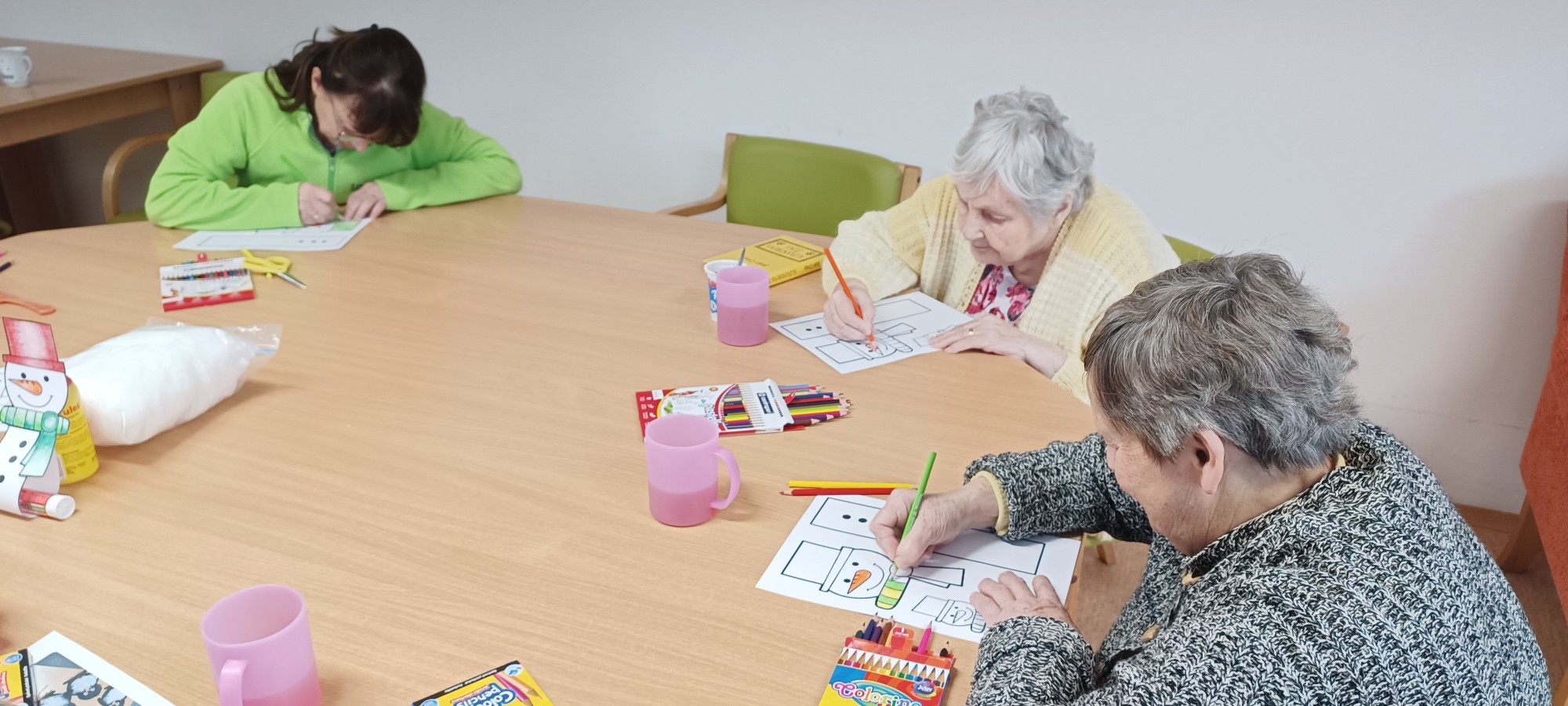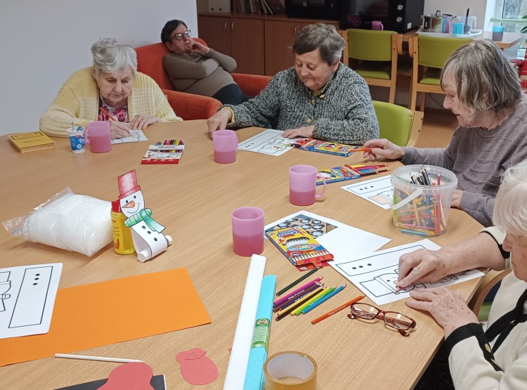 V rámci zimních aktivit jsme realizovali výtvarnou dílnu, během které vznikly dekorace sněhuláků a tučňáků. Tyto práce byly následně umístěny na osvětlení v kulturní místnosti.