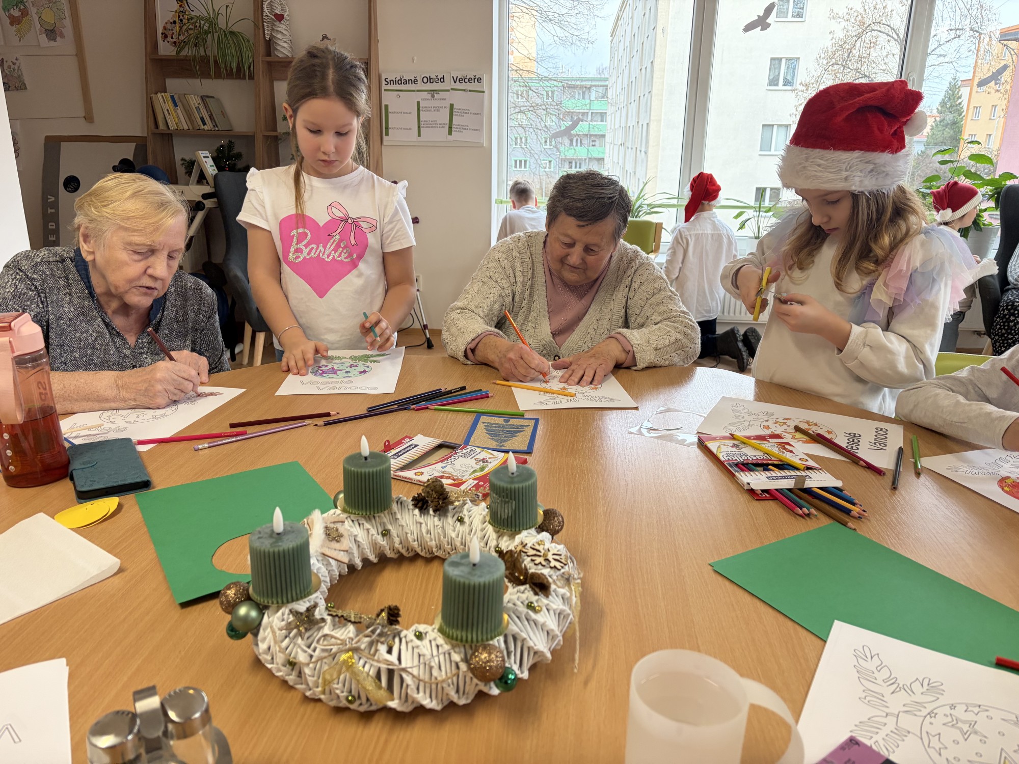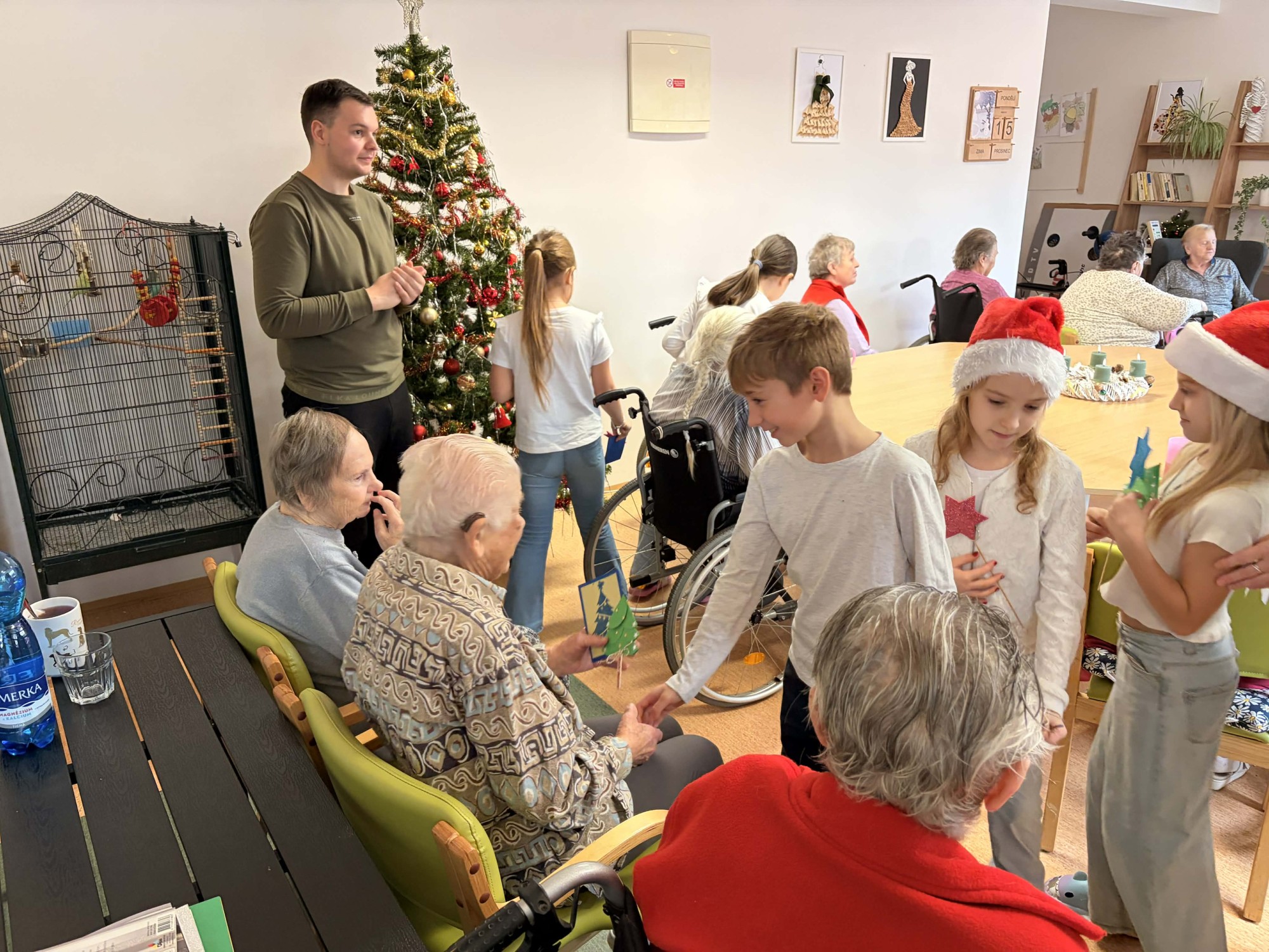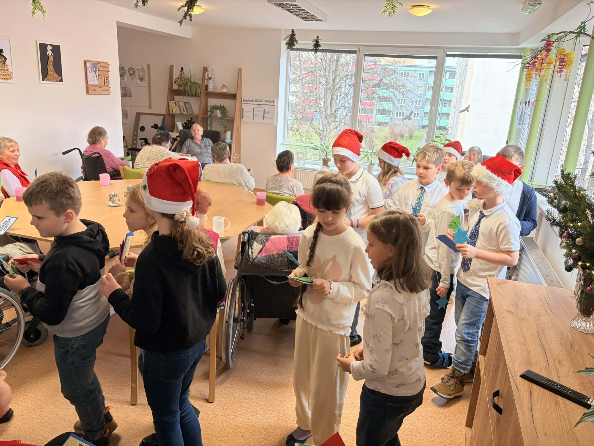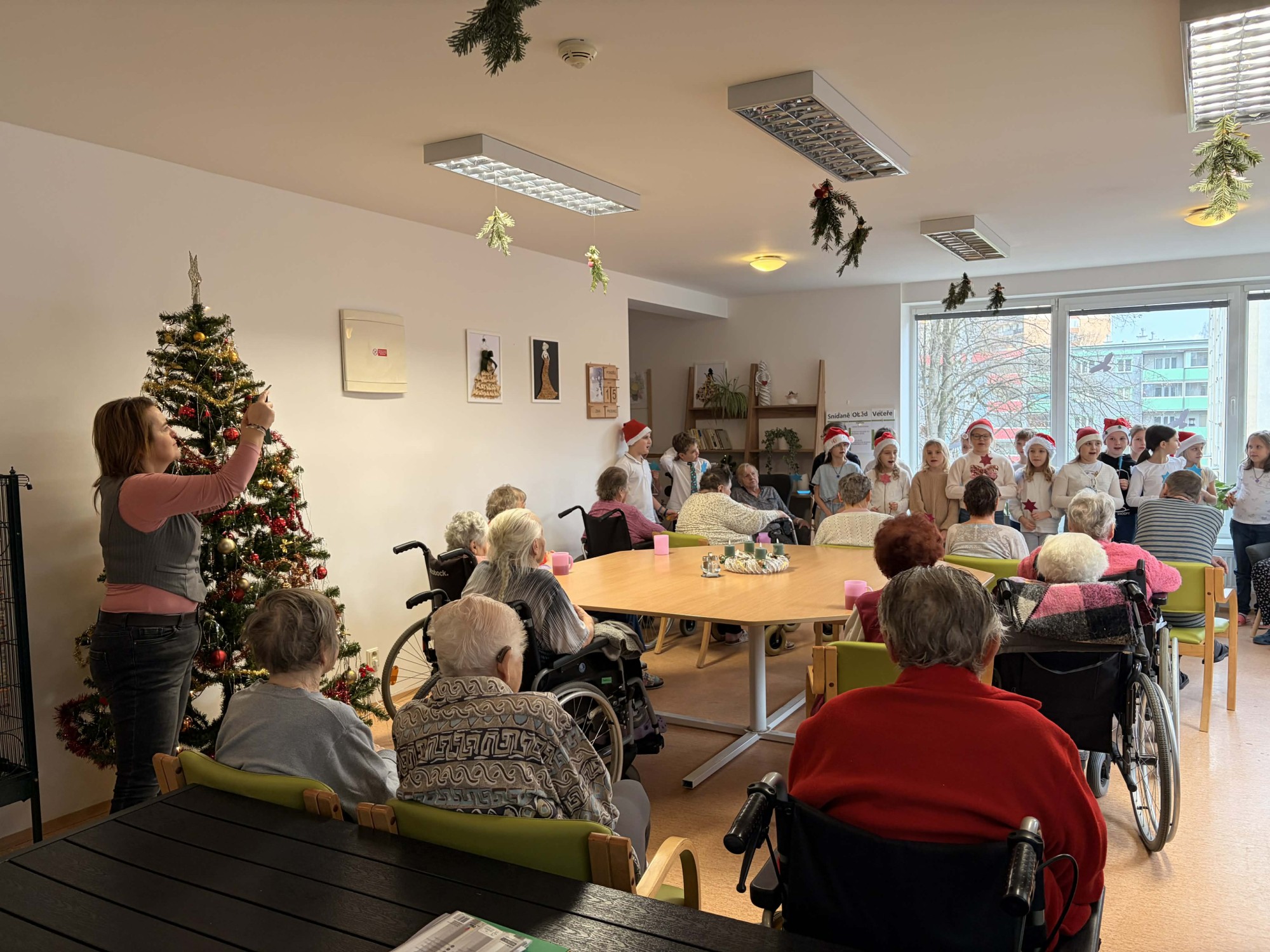 Naše klienty velmi potěšilo milé dopolední vánoční vystoupení žáků ze Základní školy Františka Formana. Děti nám přišly zazpívat krásné vánoční písničky a koledy, které naplnily společenskou místnost klidem, radostí a vánoční pohodou. Součástí vystoupení bylo také srdečné přání klidných a radostných vánočních svátků a rozdání drobných přáníček i vánočních předmětů, jež našim klientům udělaly velkou radost. Po hudebním programu následovalo společné tvoření. Děti spolu s našimi klientkami vyráběly a vybarvovaly vánoční baňky. Setkání bylo velmi příjemné a návštěva dětí nám udělala upřímnou radost. Děkujeme jim za krásné chvíle, které s námi strávily, a za radostnou energii, kterou do našeho domova přinesly.