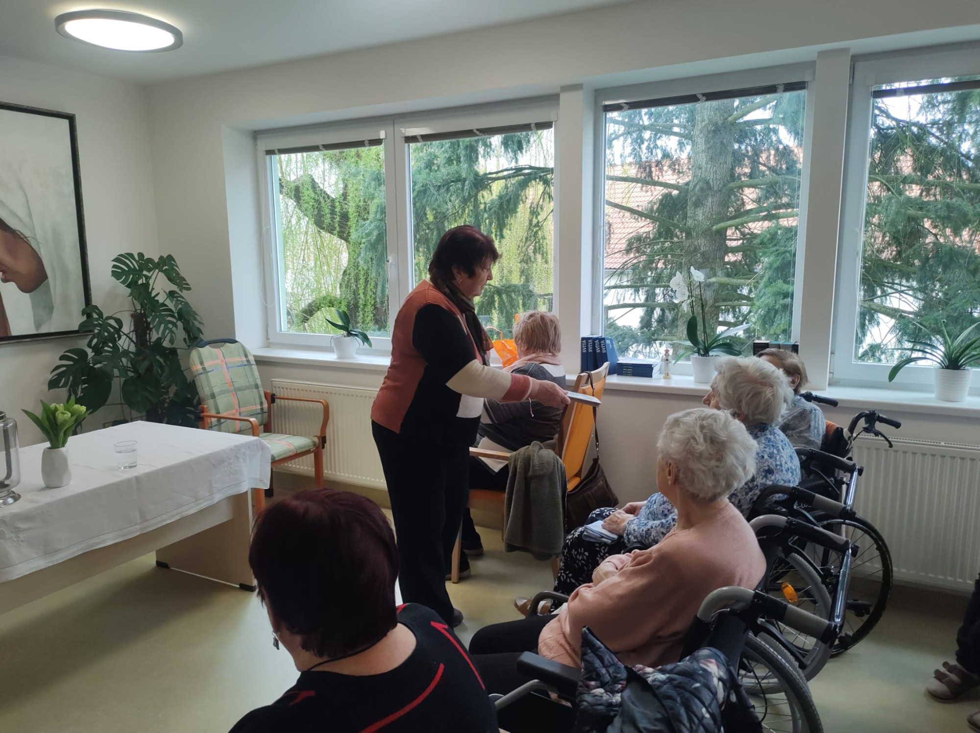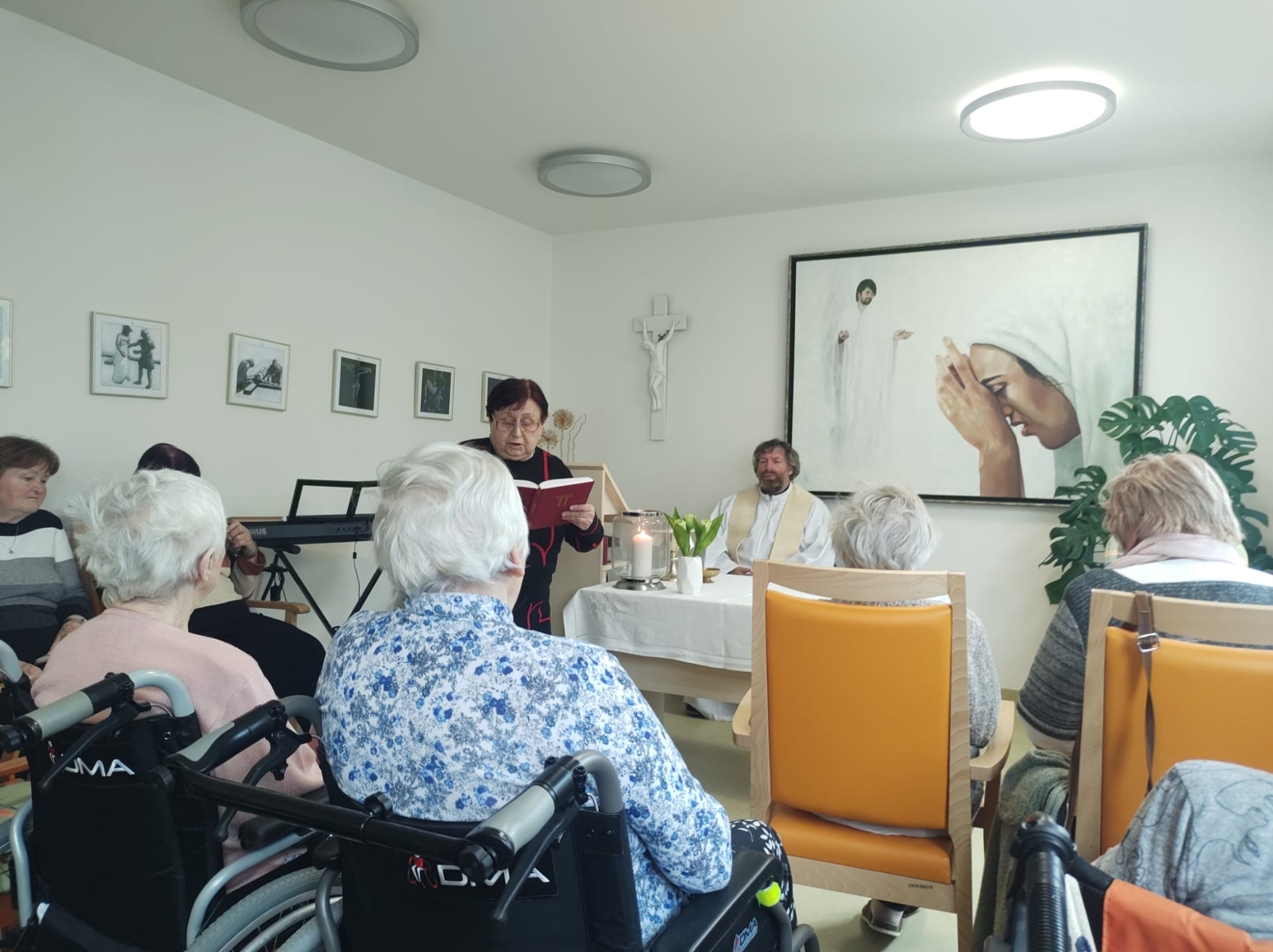 Jednou za měsíc se u nás v domově v naší malé kapli koná Mše svatá. Tentokrát byla účast skutečně hojná. Každý čtvrtek zde máme také bohoslužby a střídá se u nás celkem pět farářů různých vyznání.