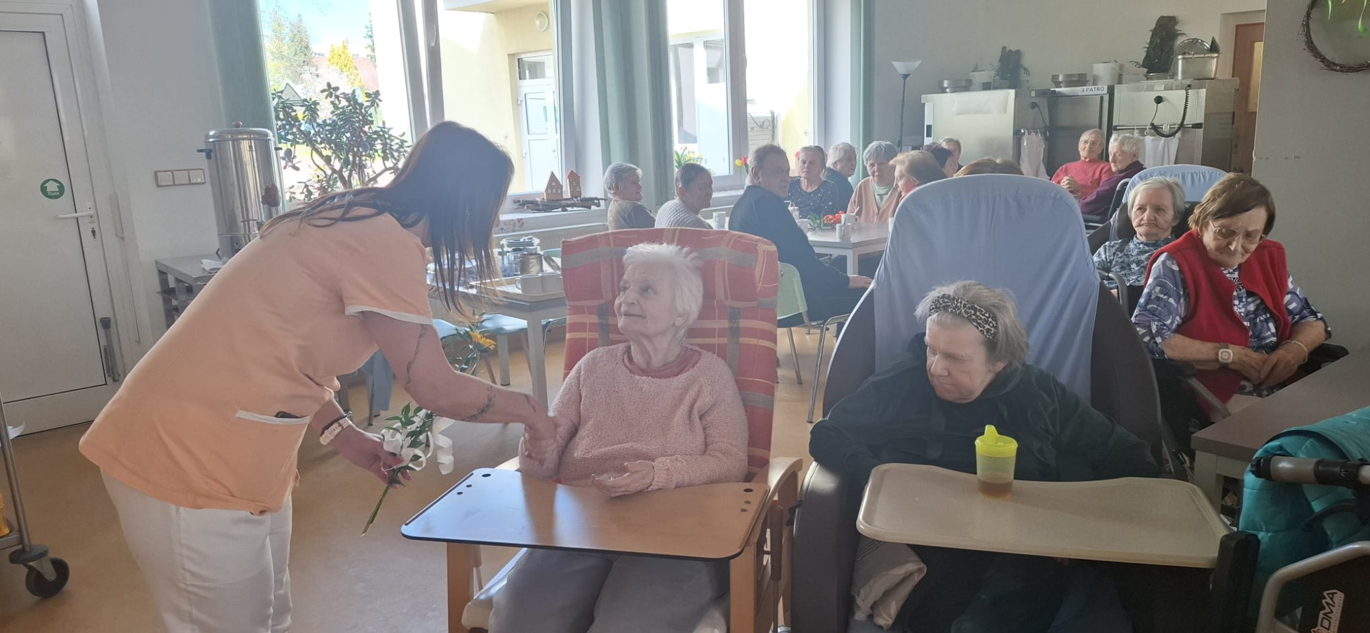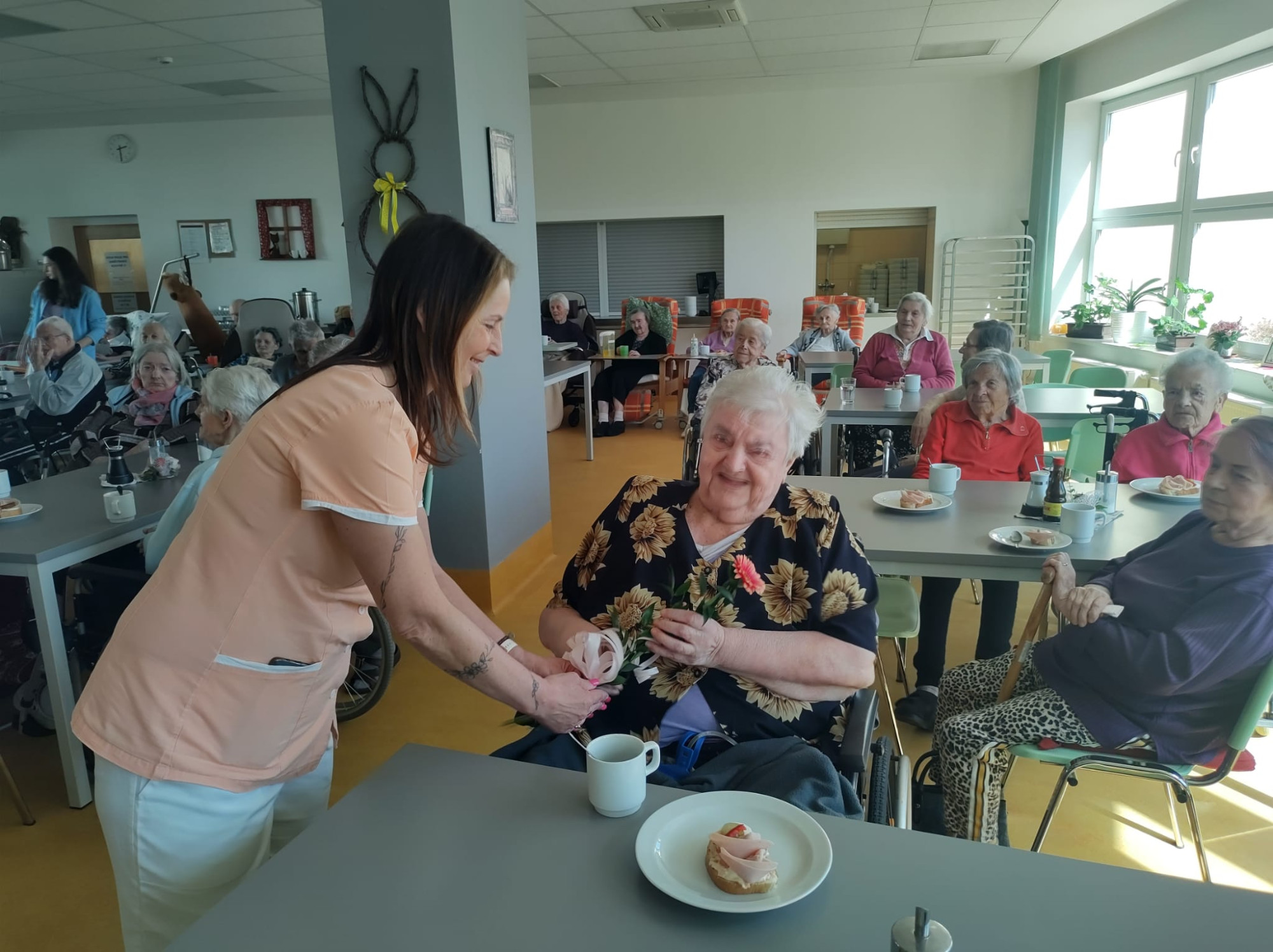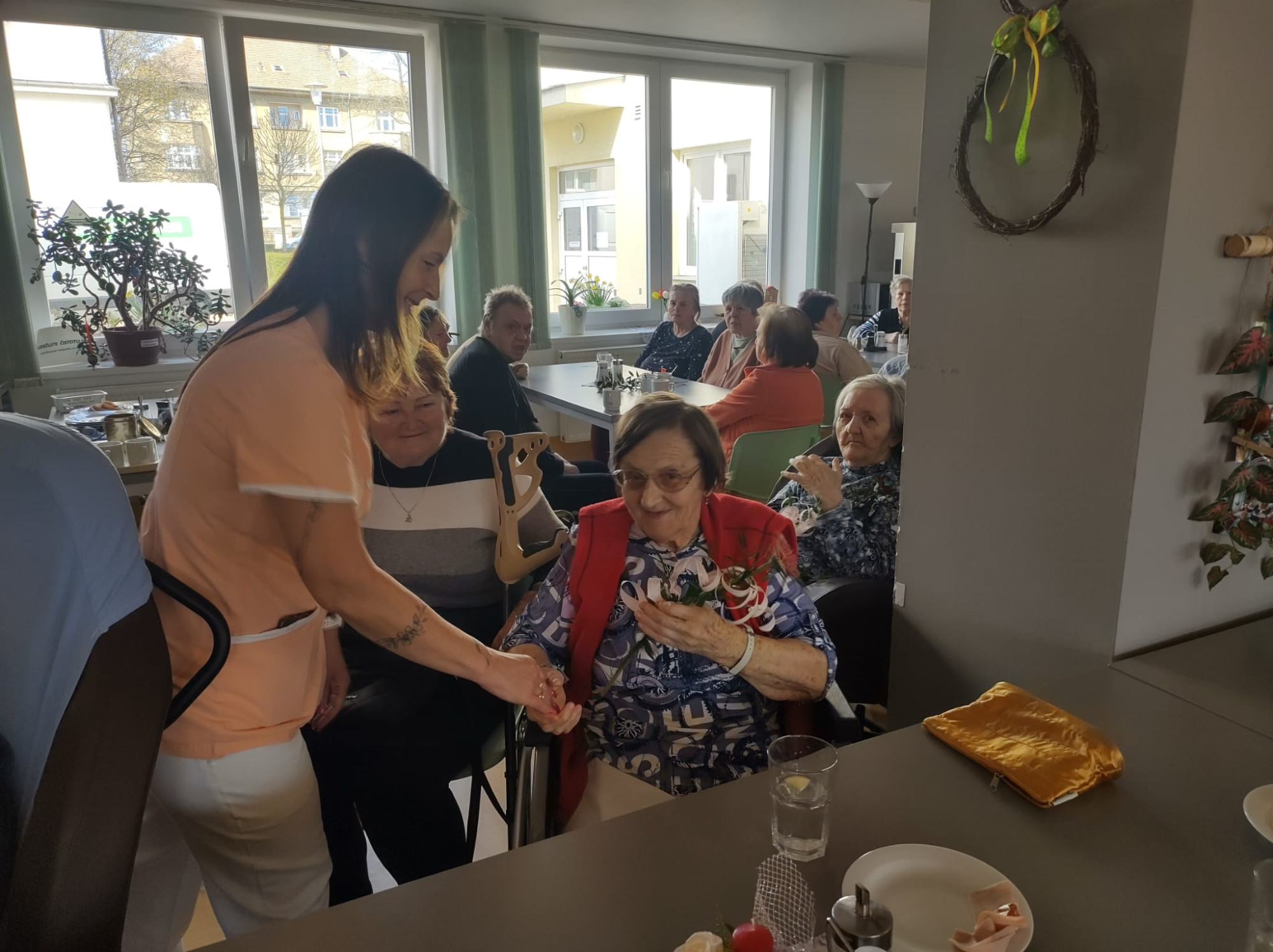 V dubnu jsme jako každý měsíc oslavili narozeniny všech klientů, kteří se narodili právě v tomto měsíci. Tentokrát slavilo celkem devět oslavenkyň a oslavenců. Každý z nich obdržel květinu a společně jsme jim popřáli vše nejlepší. Nejstarší oslavenkyně oslavila úctyhodných 93 let. Pro všechny klienty bylo připraveno malé pohoštění v podobě chlebíčku a kávy. Příjemnou atmosféru odpoledne navíc doplnily známé písně v podání harmonikáře pana Trnky. Celé setkání jsme si velmi užili a strávili společně krásné odpoledne.