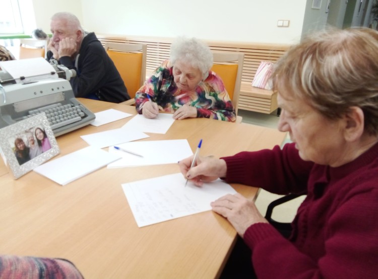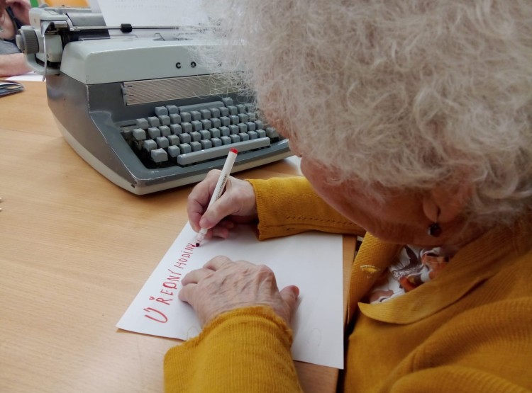 Často si povídáme a vzpomínáme. Tentokrát jsme si povídali o dobách, kdy jsme ještě chodili do zaměstnání. A protože většina z našich dam pracovala na poště, úřadě nebo v kanceláři, využili jsme starý psací stroj a společně se vrátili k psaní dopisů, úředních hodin, zápisům z porad .... Velmi se nám tento program líbil.