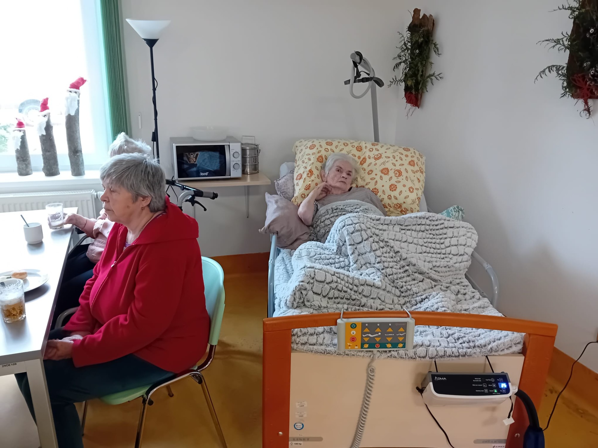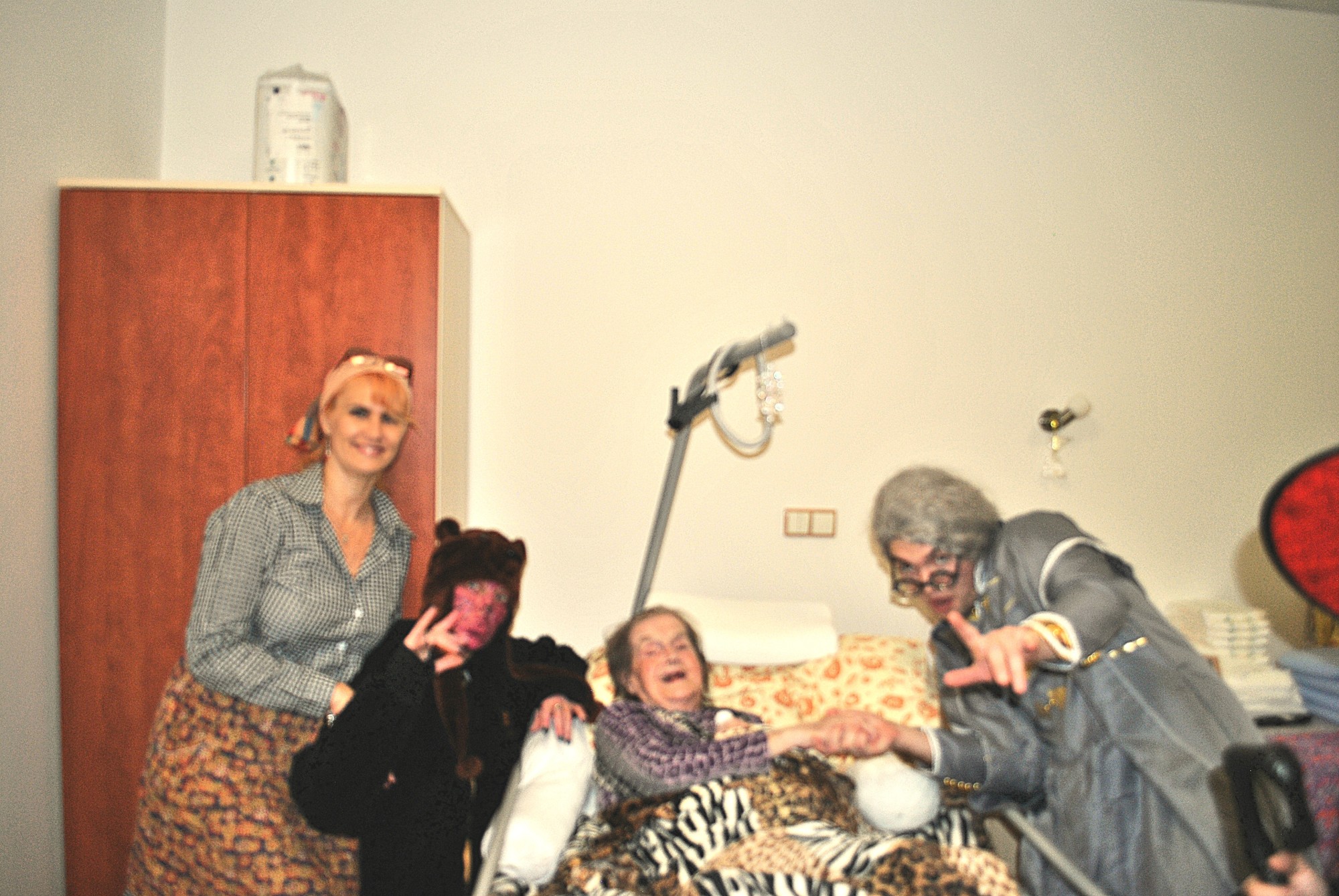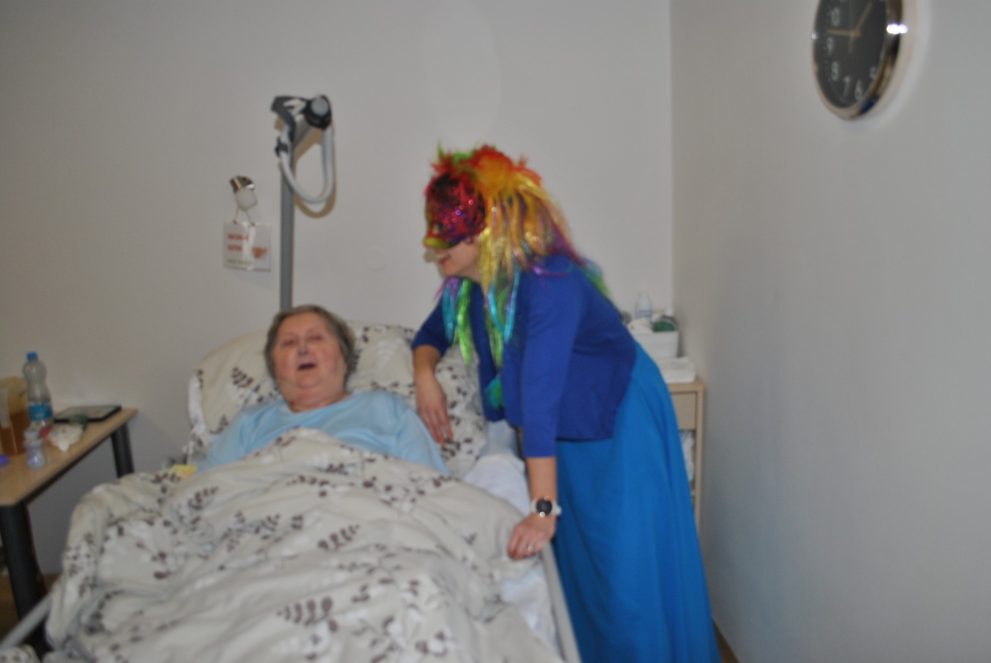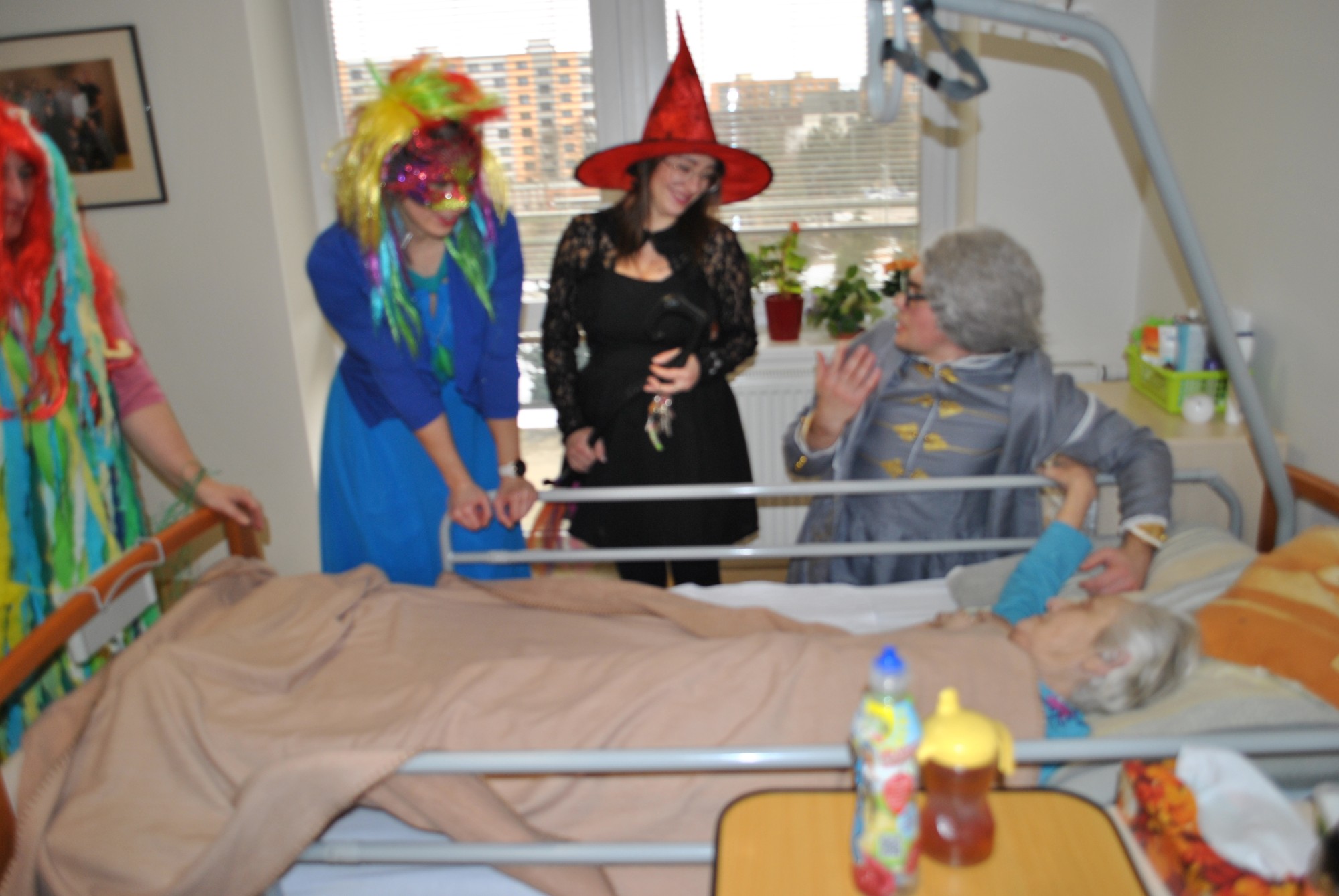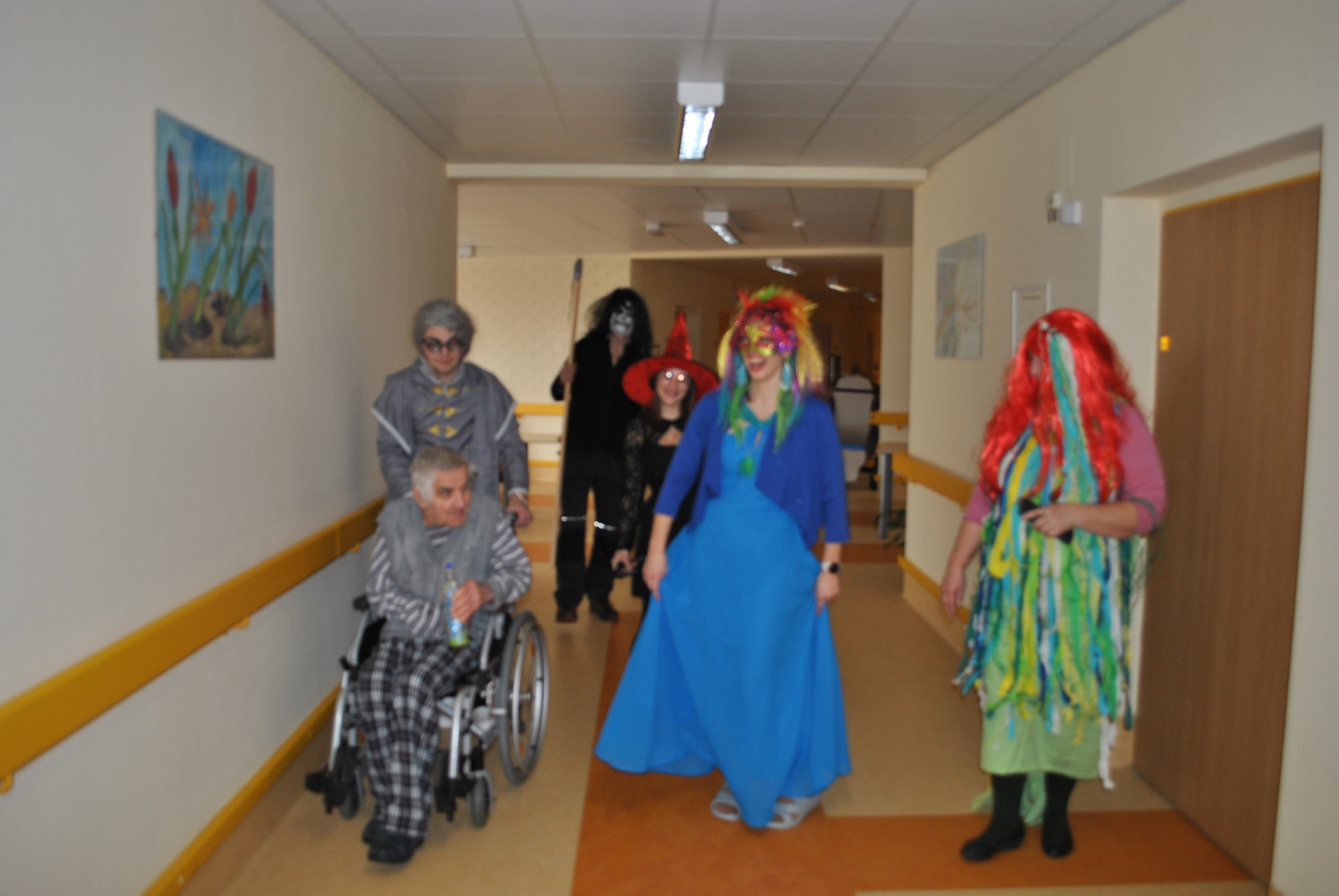 Masopustní chasa nejprve obešla jednotlivá patra a potěšila klienty, kteří se nemohli zúčastnit programu v jídelně. Poté dorazil pestrý masopustní průvod plný masek i mezi ostatní klienty do jídelny. K vidění byl medvěd, smrtka, babka, čarodějnice, mořská panna a řada dalších veselých postav.