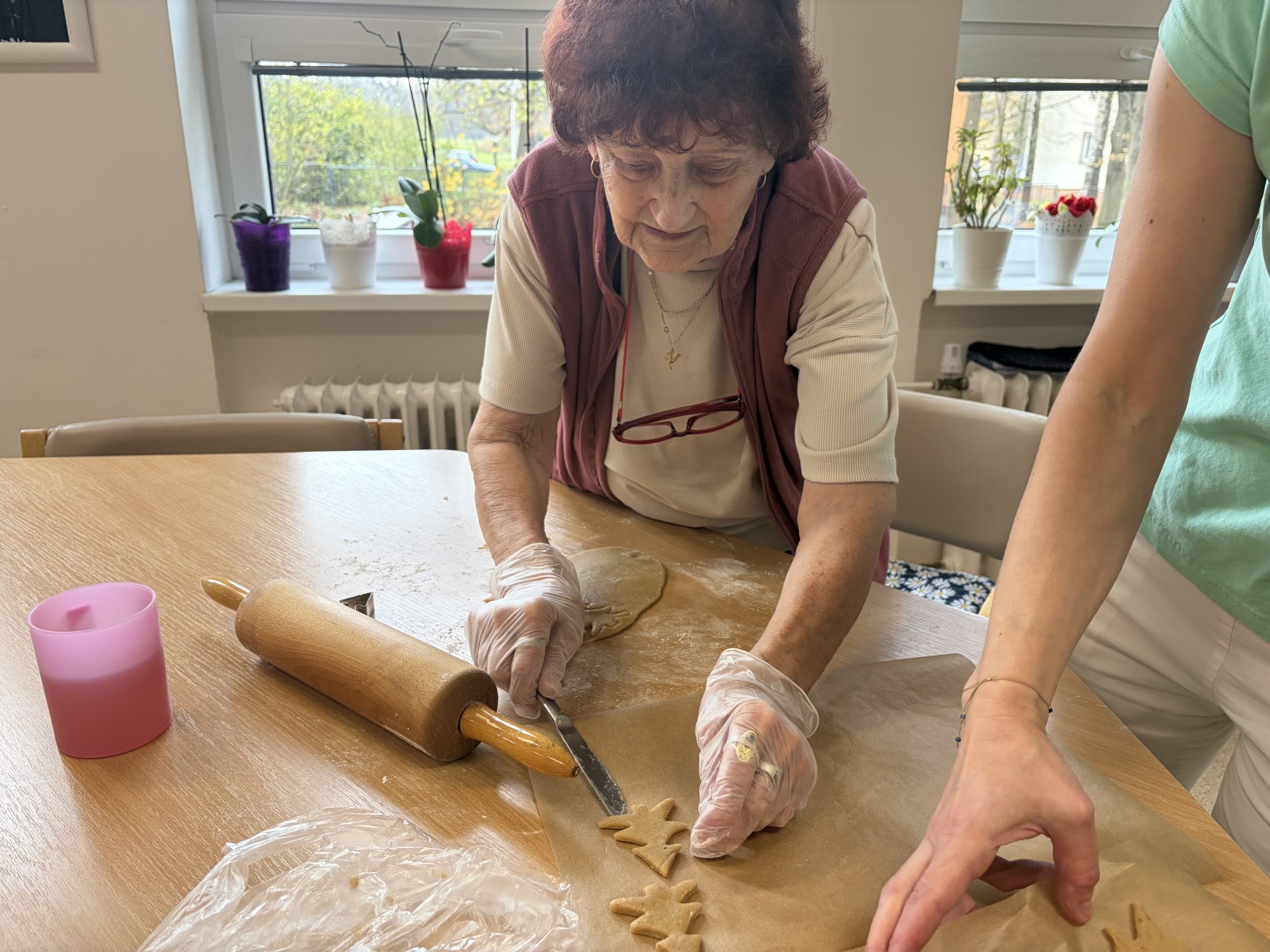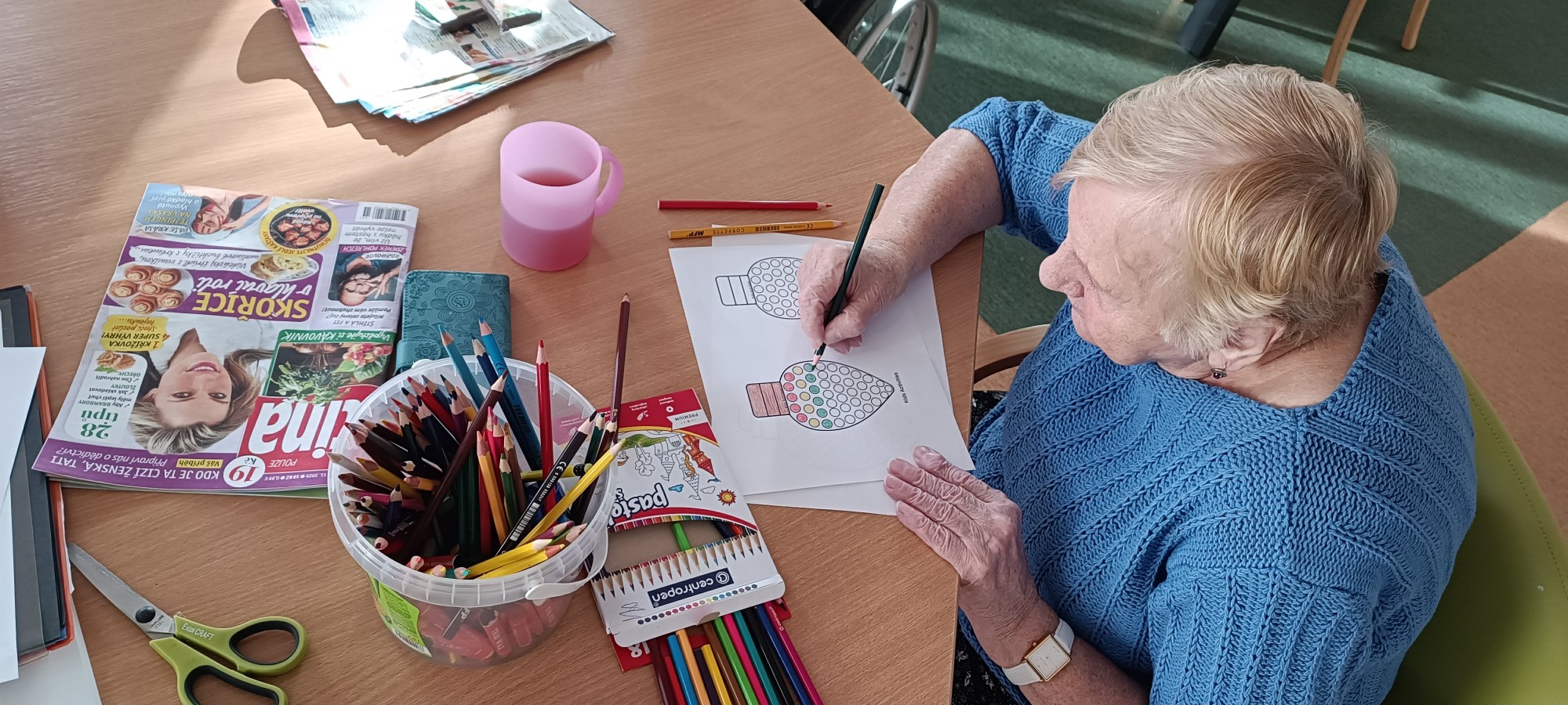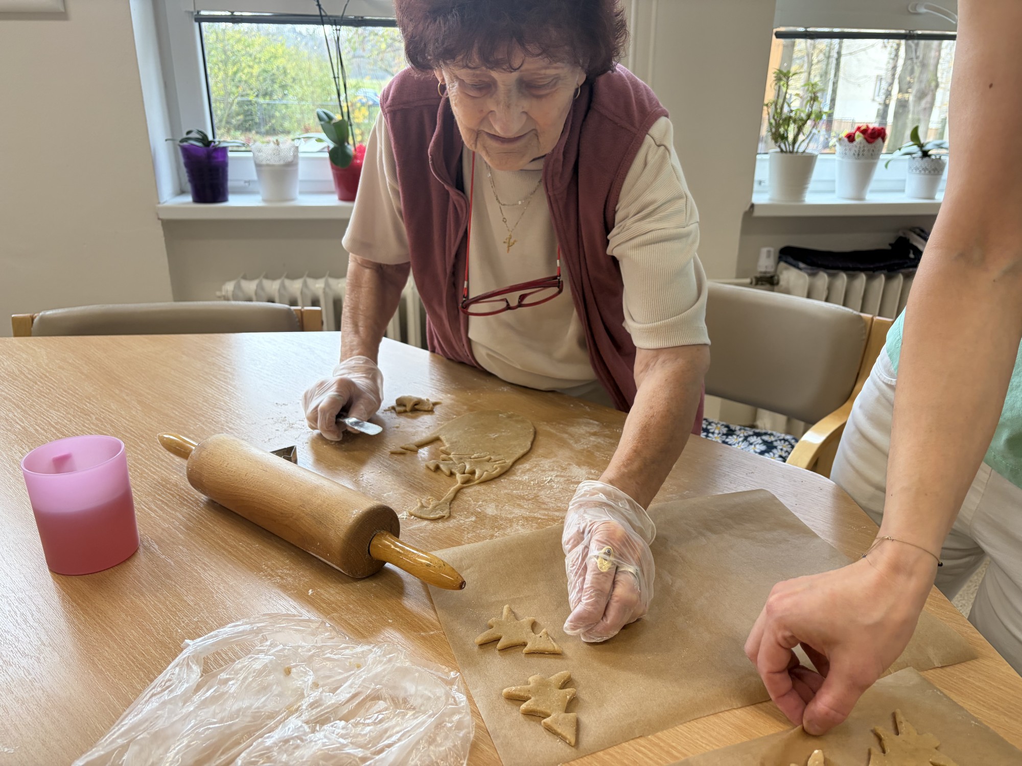 V našem Domově pokračujeme ve vánočním tvoření. Tentokrát jsme si připravili malé tvořivé dopoledne, během kterého jsme stříhali papírové jmelí, vybarvovali vánoční baňky a pustili se také do pečení perníčků na blížící se vánoční trhy.
