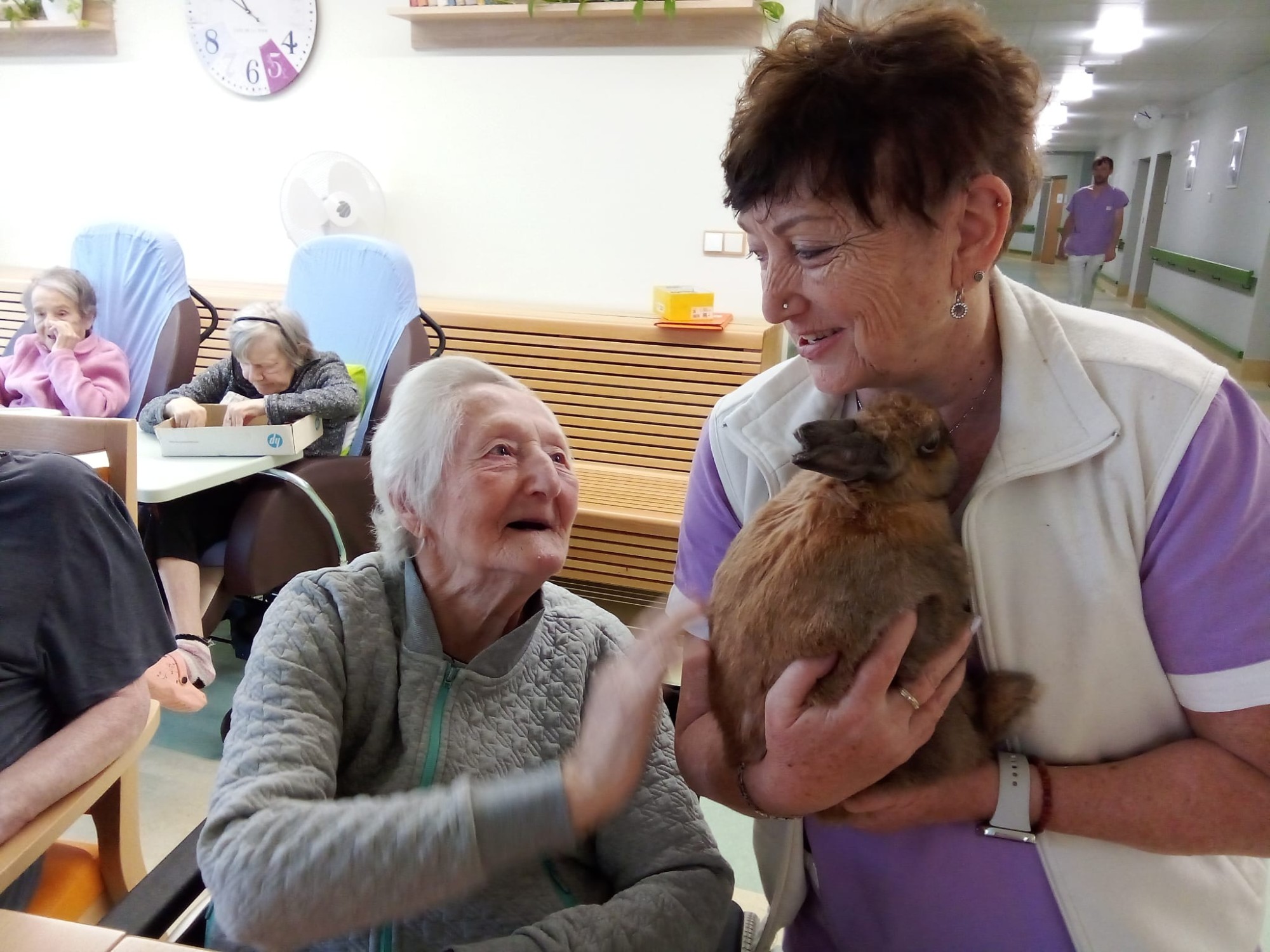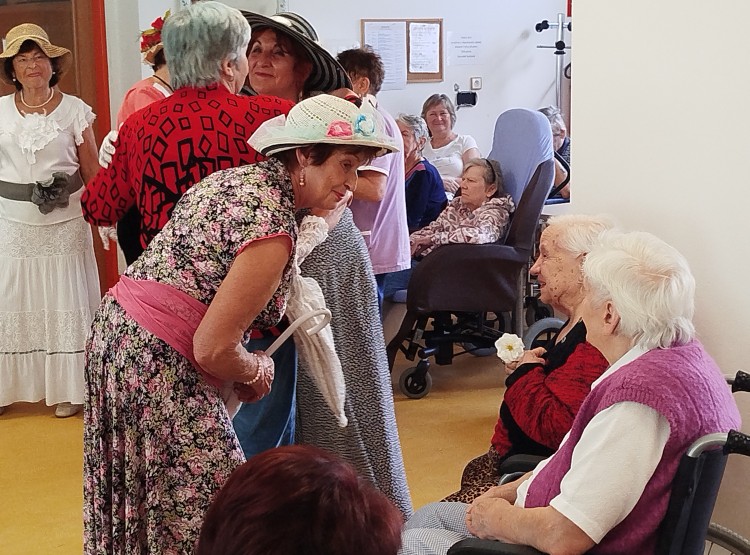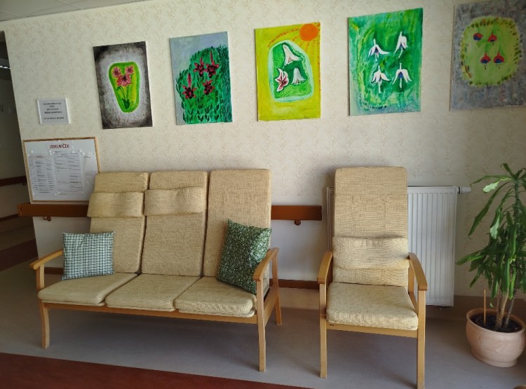 Po prázdninách jsme se konečně dočkali setkání s dětmi z mateřské školy Pod Smrkem. Tentokrát se programu, který si pro nás děti připravily, účastnila i paní Lucie. Pod její hudební taktovkou jsme si procvičili celé tělo a zazpívali si známé písničky. Moc jsme si užili módní přehlídku prvorepublikové módy Sester Chalupových. Pobavili jsme se, dozvěděli se hodně o módě, která se nosila před sto lety. Jednou z nejoblíbenějších terapií je petterapie. O našeho králíka se staráme a mazlíme se s ním, on nám naši péči a lásku vrací. Výklenky jsou místa, kde se scházíme, povídáme si, odpočíváme, odehrává se tam velká část našich životů. Máme radost, že je svými obrázky ozdobila klientka našeho domova paní Božena Nasadilová. V září proběhla vernisáž jejích obrazů, paní Nasadilové velice děkujeme.